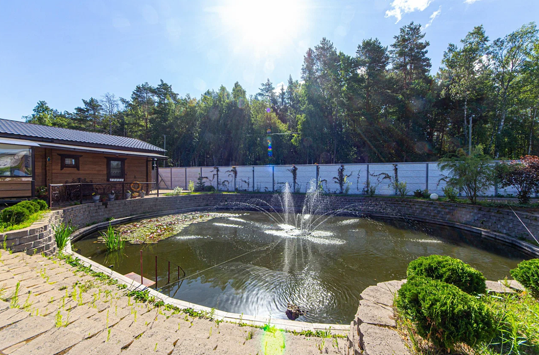 На территории водоем 20х16м с проточной водой в 20 м от бани, можно окунуться или моржевать. Зимой t воды в водоеме + 4С. Летом комфортно + 20-25С, можно купаться, глубина водоема до 2,5м.
