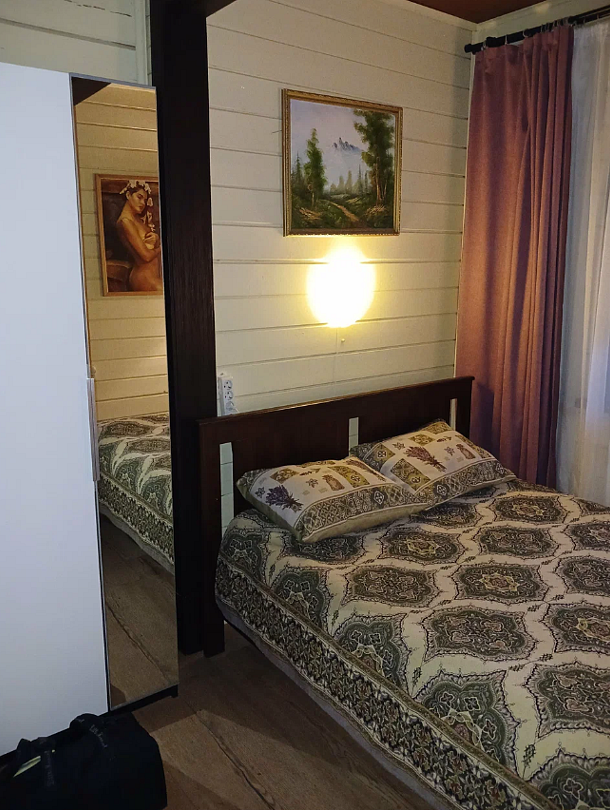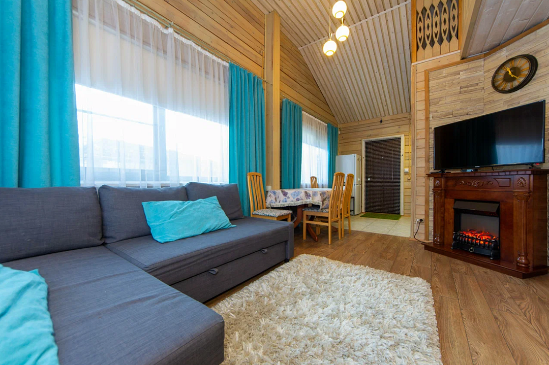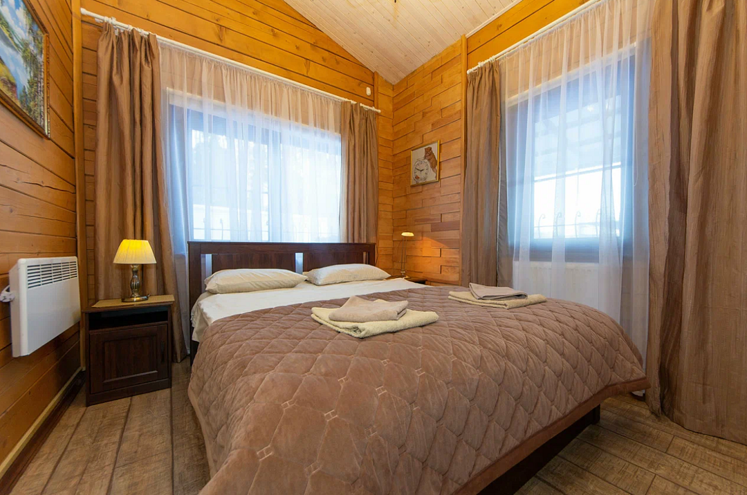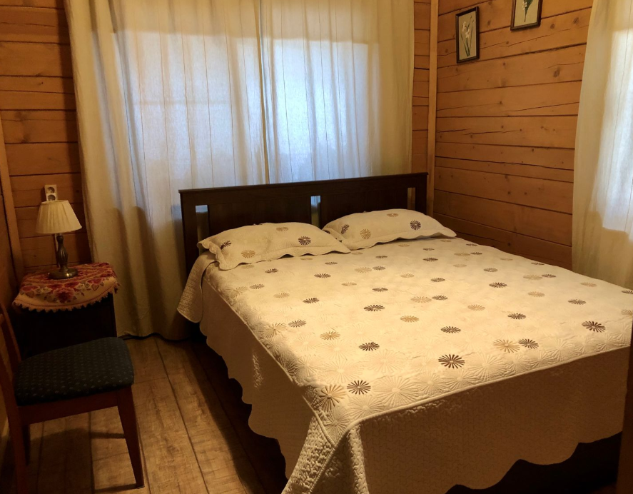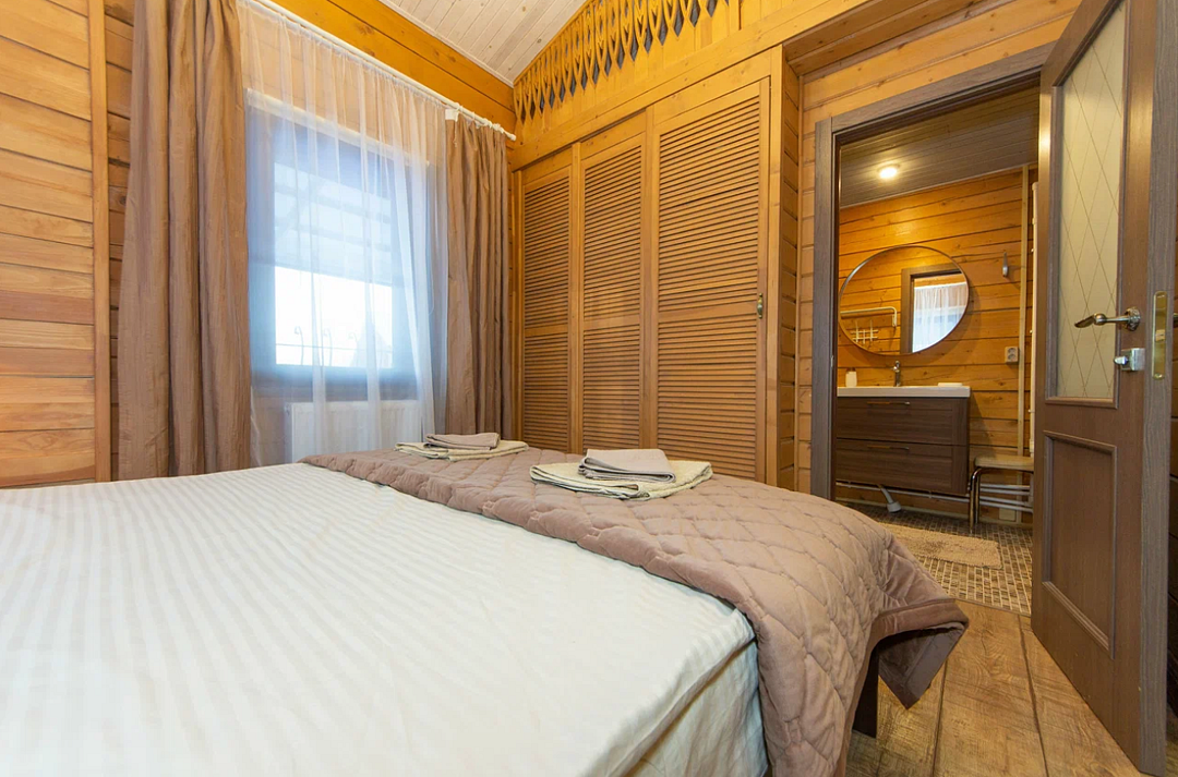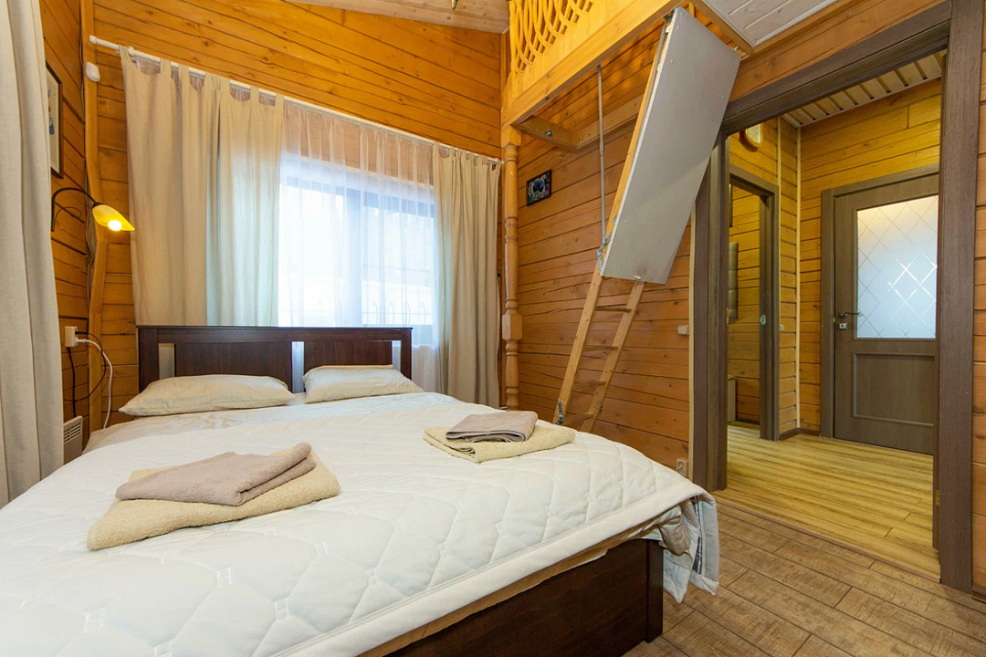 В доме отдельная спальня с двуспальной кроватью, туалетная комната с душевой кабиной, лофт с 2-х спальным матрасом, кухня-гостиная с двуспальным диваном, сауна на дровах, выход на мангальную зону. Интернет Wi-Fi — высокоскоростной.