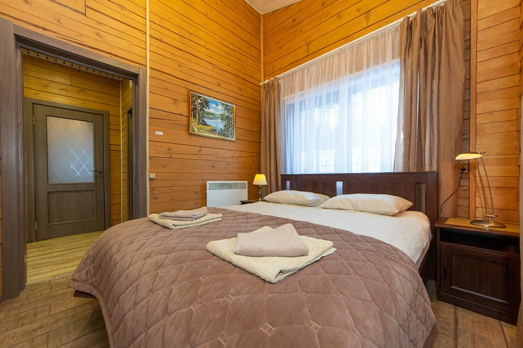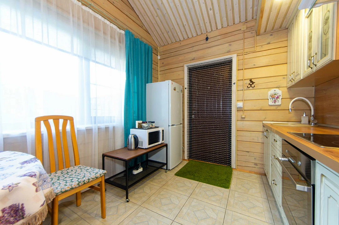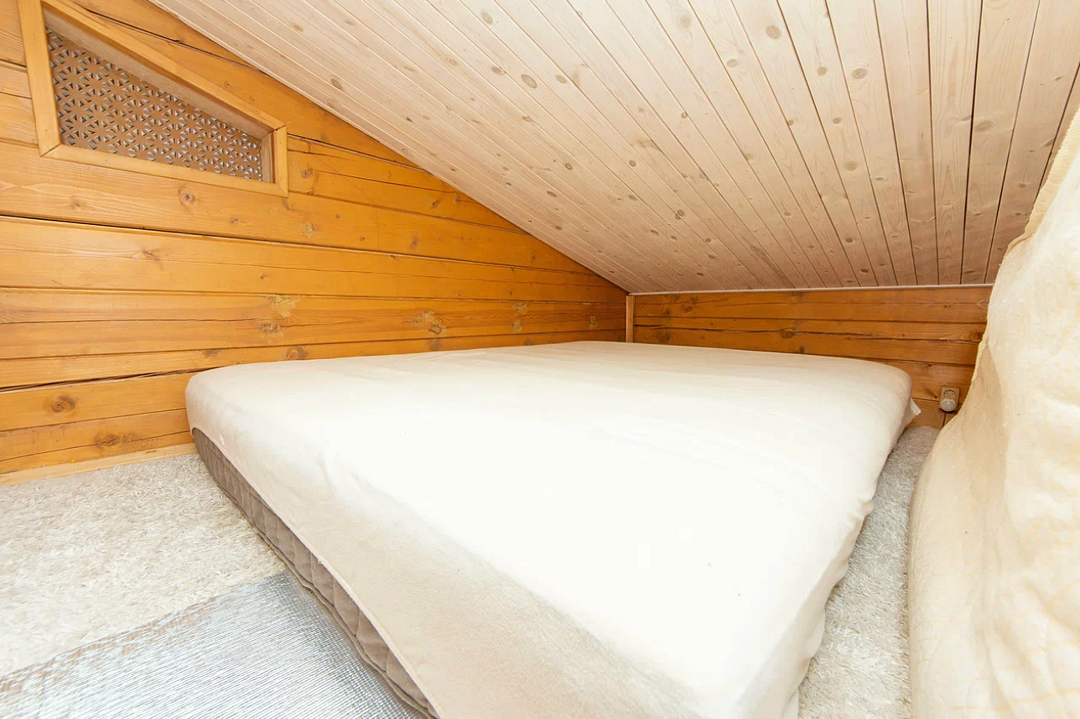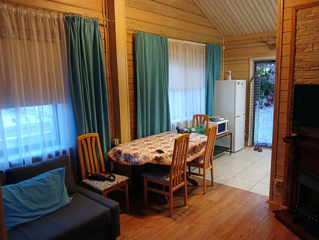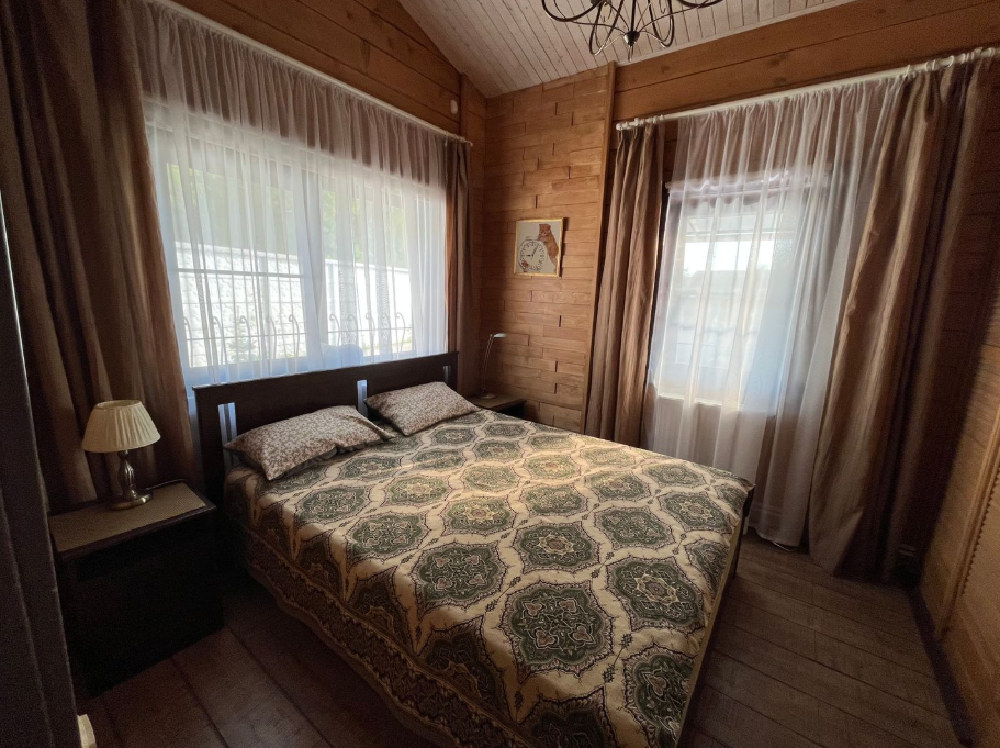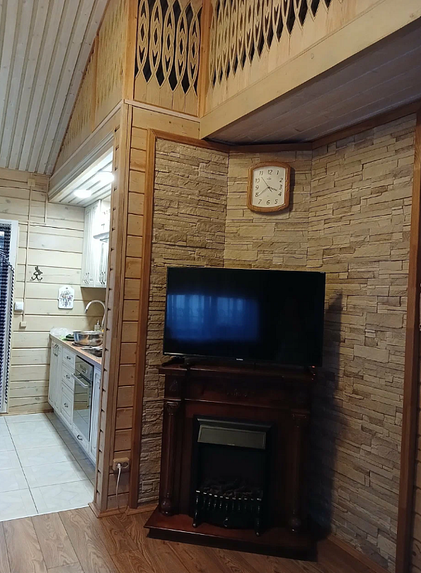 В доме отдельная спальня с двуспальной кроватью, туалетная комната с душевой кабиной, лофт с 2-х спальным матрасом, кухня-гостиная с двуспальным диваном, сауна на дровах, выход на мангальную зону. Интернет Wi-Fi — высокоскоростной.