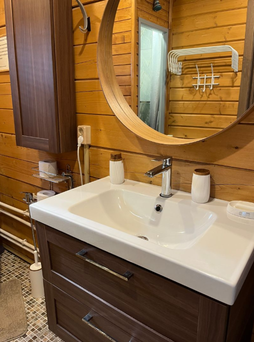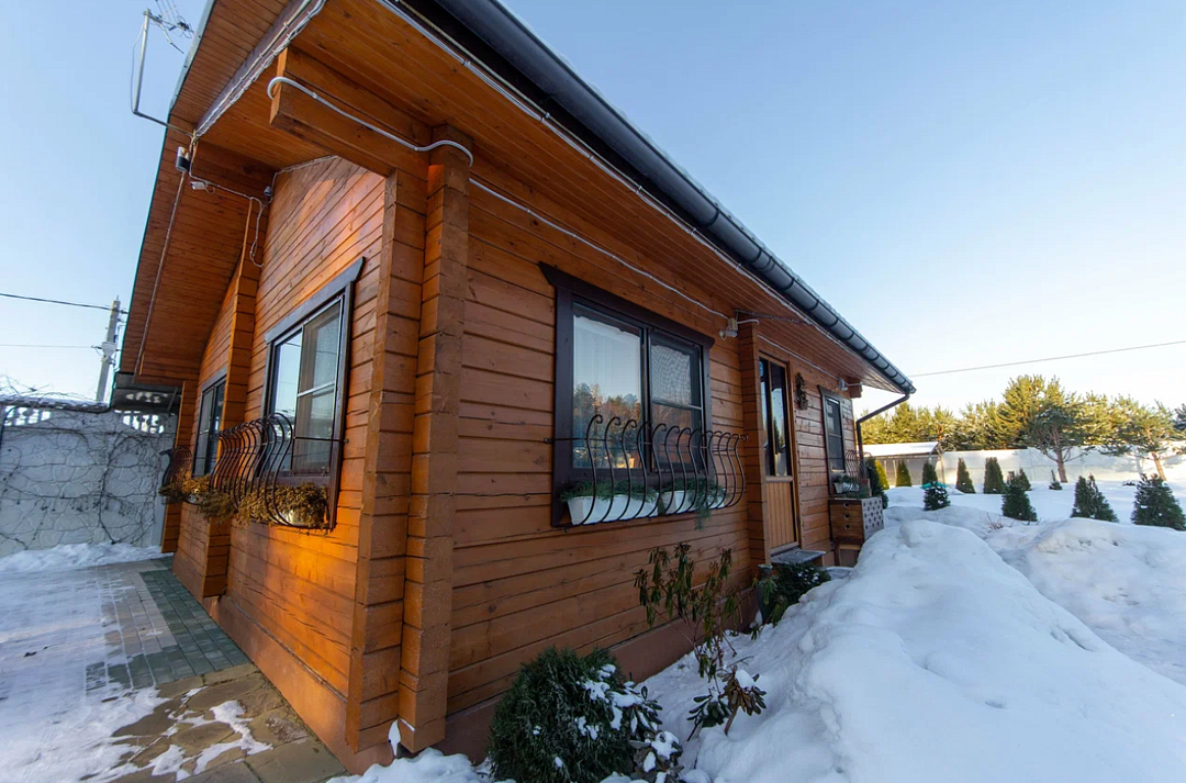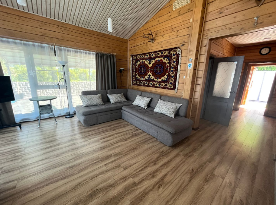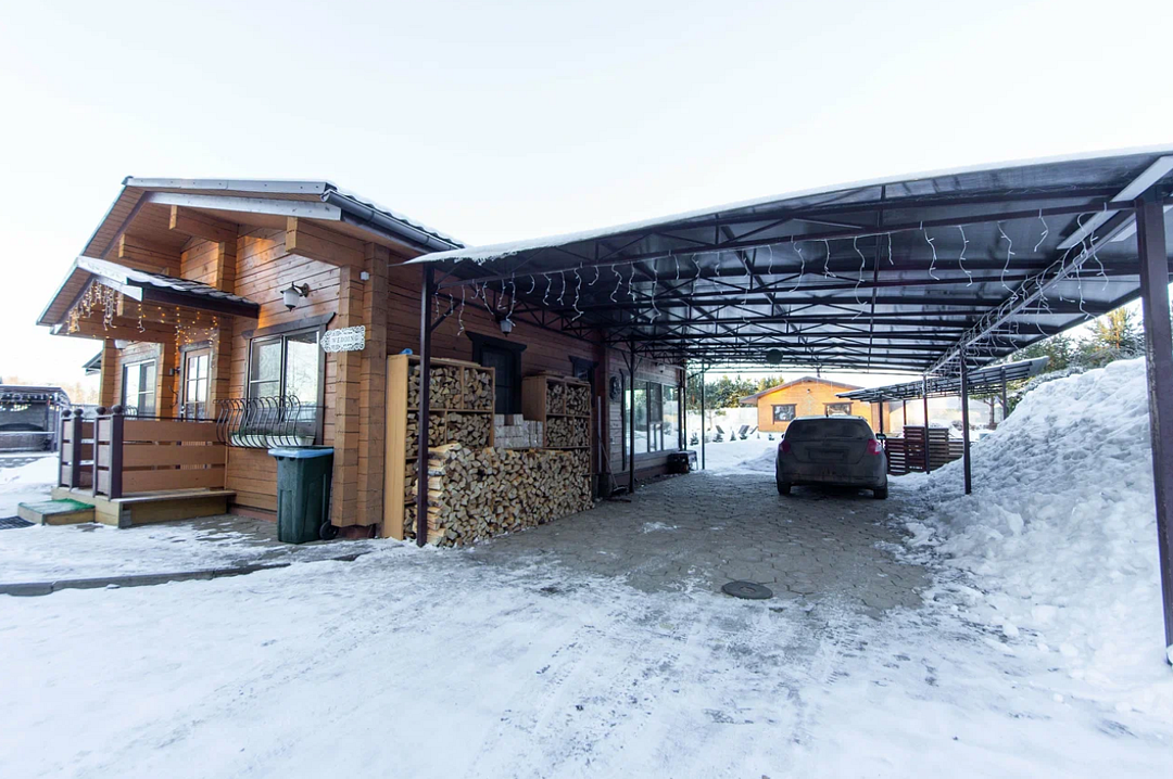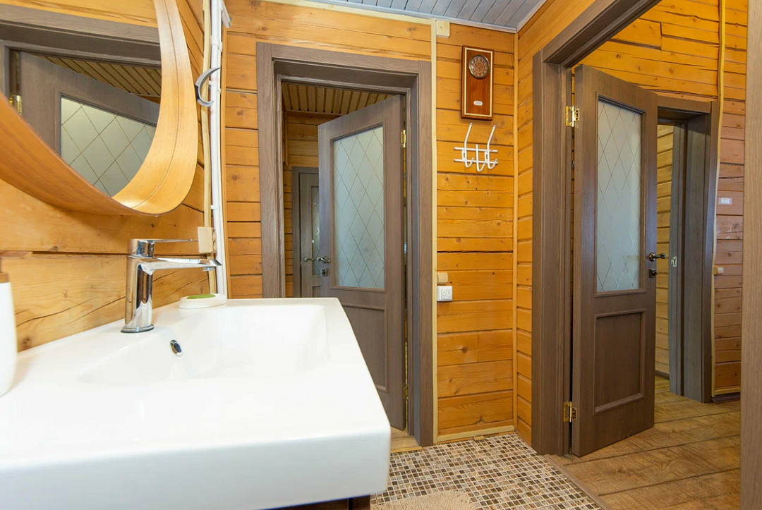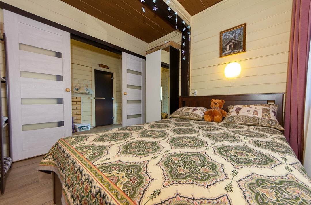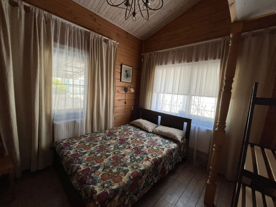 В доме отдельная спальня с двуспальной кроватью, туалетная комната с душевой кабиной, лофт с 2-х спальным матрасом, кухня-гостиная с двуспальным диваном, сауна на дровах, выход на мангальную зону. Интернет Wi-Fi — высокоскоростной.