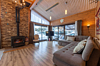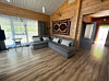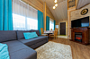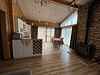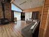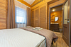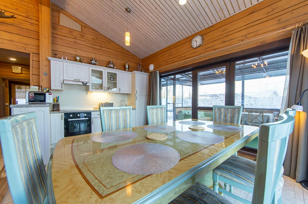 В коттедже просторная кухня-гостиная 40 кв.м. с камином, две отдельная спальни с двуспальными кроватями и санузлами в каждой комнате, лофт с 2-х спальным матрасом, застекленная терраса у водоема.