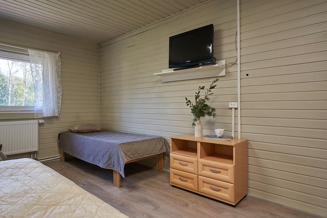 Номер со своей территорией и мангалом, со всеми удобствами. В номере располагается спальня (односпальные кровати), кухня (холодильник, чайник, набор посуды), комод, 1 дополнительное место, санузел (душевая кабина, раковина, туалет), выход на придворовую территорию с мангалом.