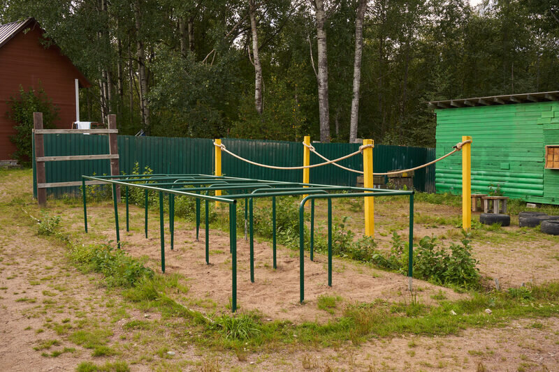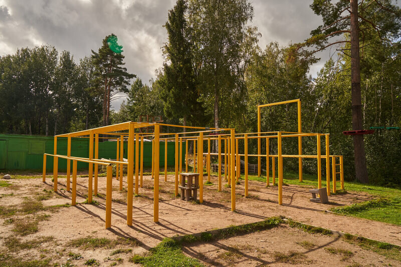 Гимнастический городок с рукоходами, турниками и брусьями. Военный городок с элементами полосы препятствий, тиром и мишенями для метания ножей, серюкенов.