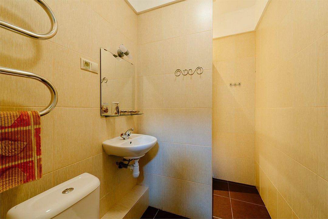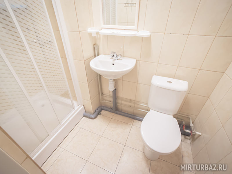 Санузел номера "полулюкс". Душевая кабина, унитаз, умывальник, электровытяжка, напольное покрытие — плитка.