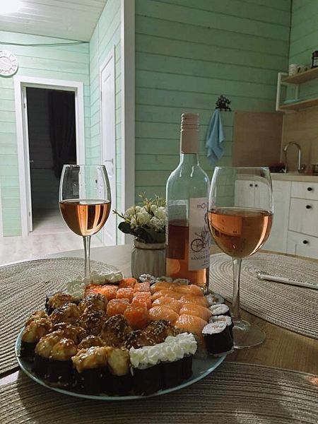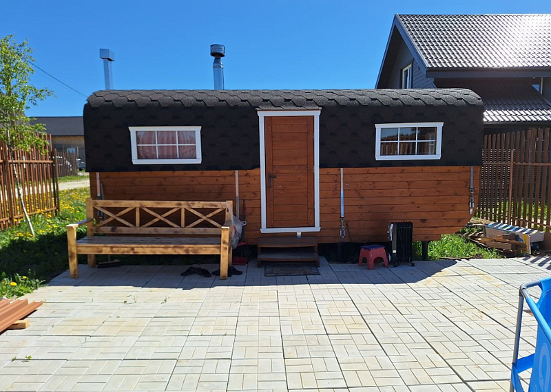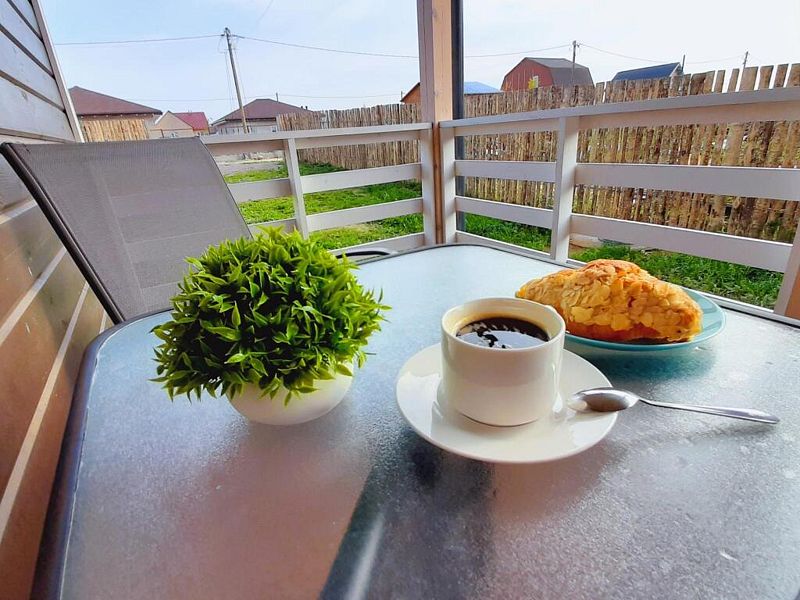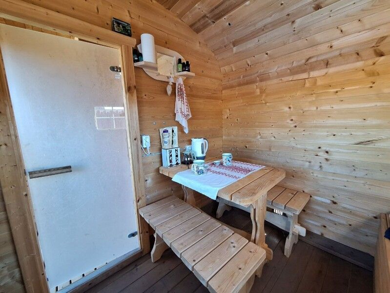 На террасе, оборудованной столиком и стульями, можно насладиться чашечкой кофе или полюбоваться закатом. А в настоящей дровяной бане с чаном вы сможете расслабиться и восстановить силы.