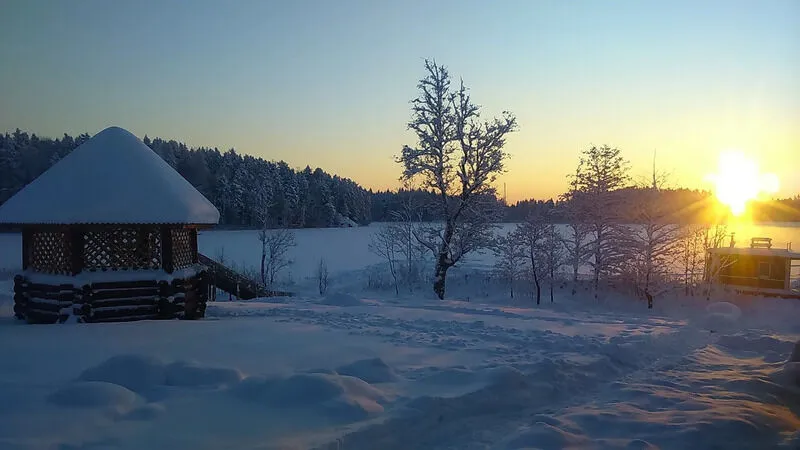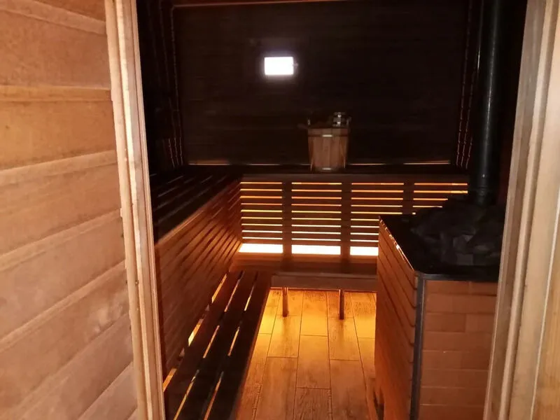 Универсальная парная с ароматными берёзовыми и дубовыми вениками, душ, обливная кадушка и комната отдыха с удобной деревянной мебелью. После всех оздоровительных процедур можно насладиться ароматным чаем из самовара. Также после бани вы можете нырнуть в озеро, а зимой в прорубь.