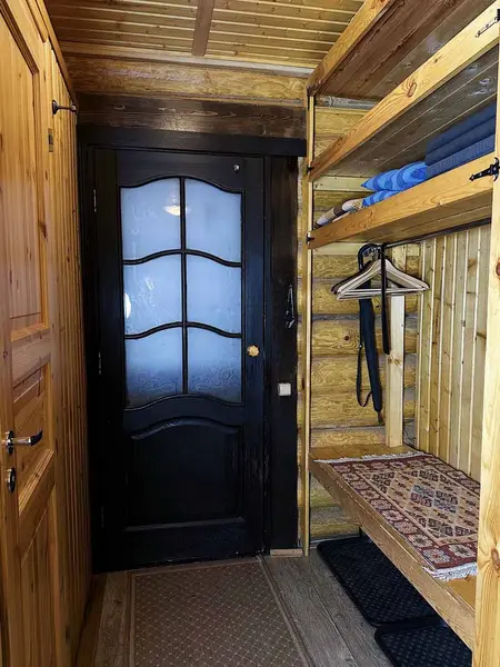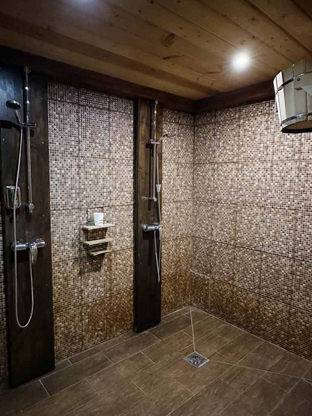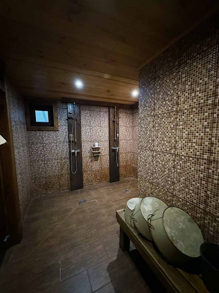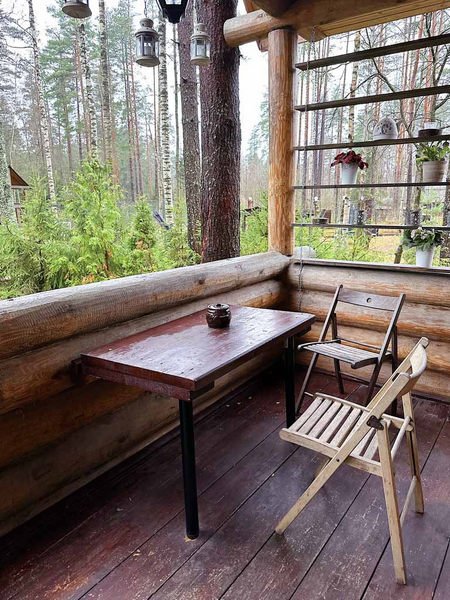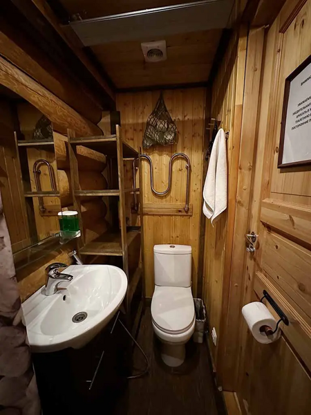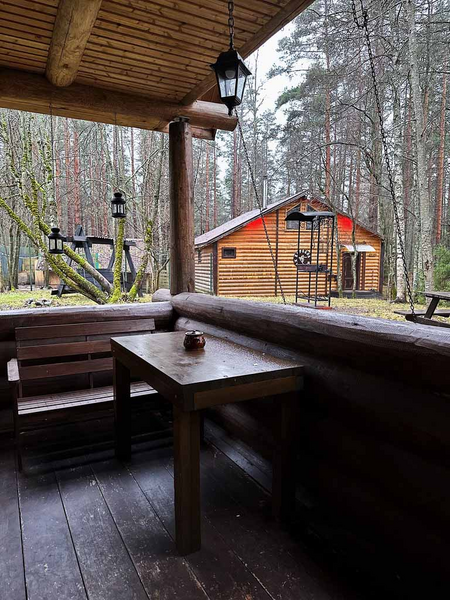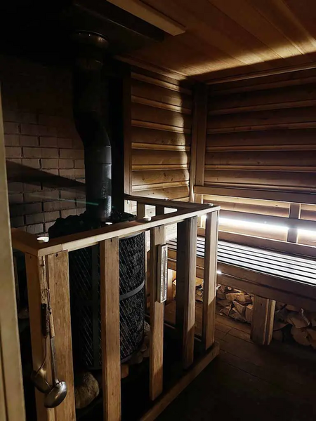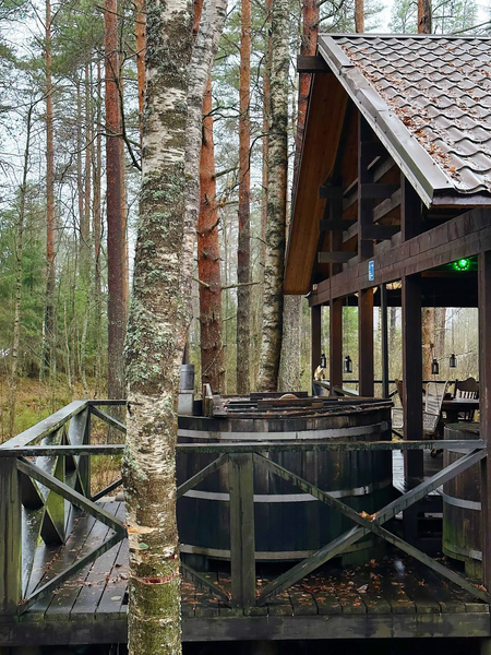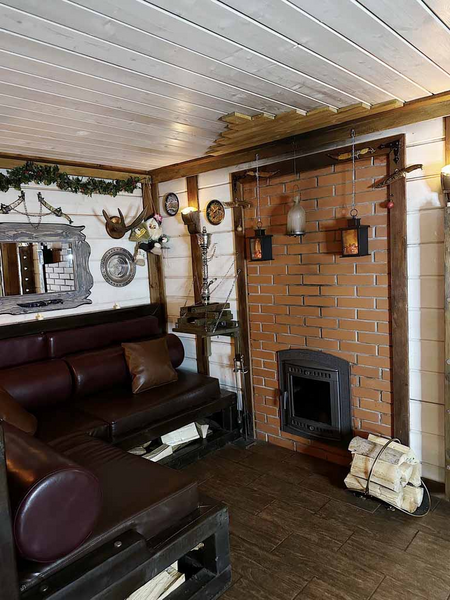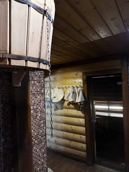 В бане есть русская парилка, два душа, обливное ведро с холодной водой, камин, кухня, зона отдыха, телевизор, настольный футбол, купель с холодной водой и терраса с видом на лес.