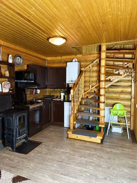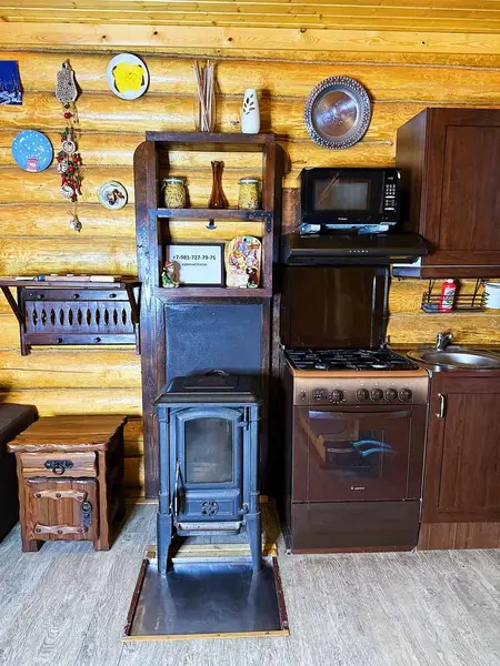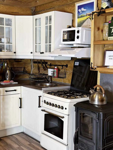 На первом этаже - в наличии микроволновая печь в кухонной зоне, камин - печь, телевизор, холодильник, детская кроватка-манеж.