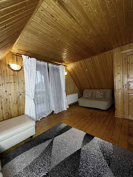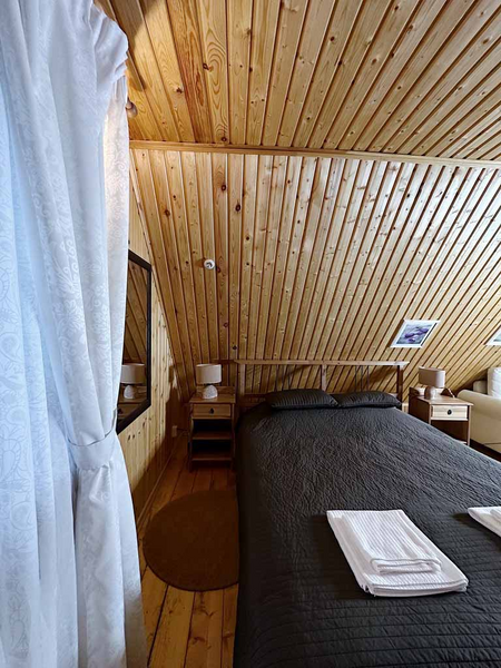 Второй этаж помимо большой кровати оснащён двумя двуспальными диванами.