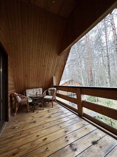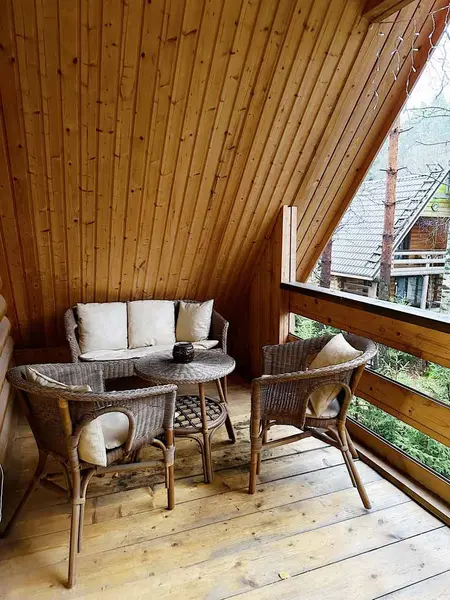 Уютный балкон с диваном и креслами на втором этаже у первой спальни.