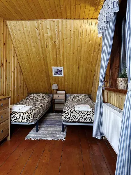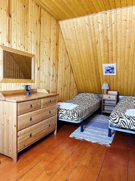 На втором этаже - в одной спальне две односпальных кроватей, во второй спальне - двуспальная кровать и двуспальный диван.