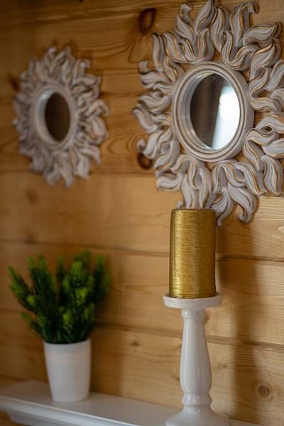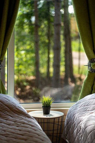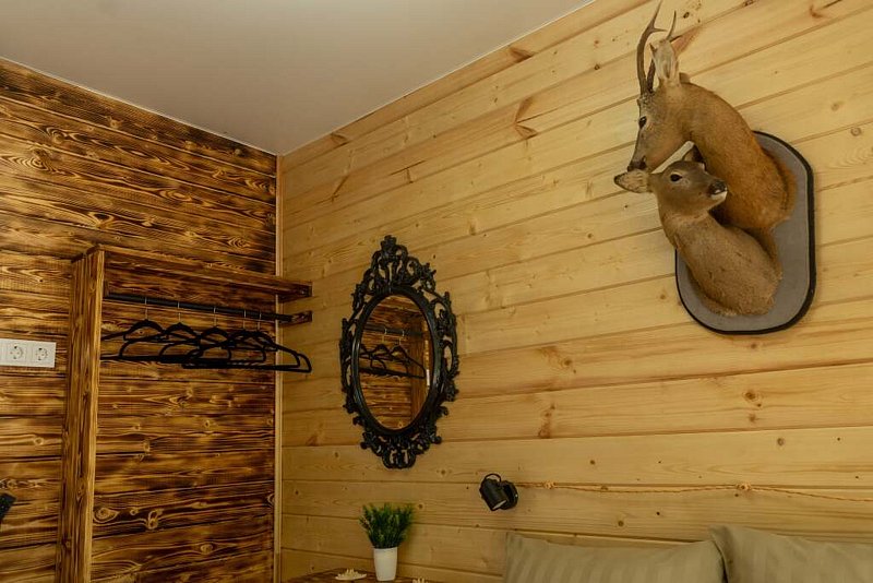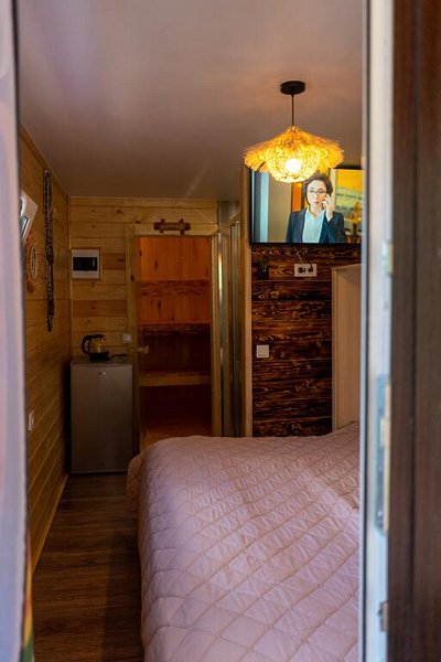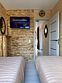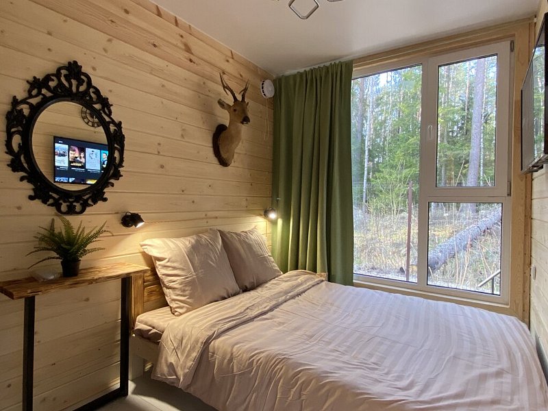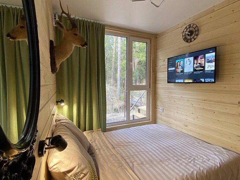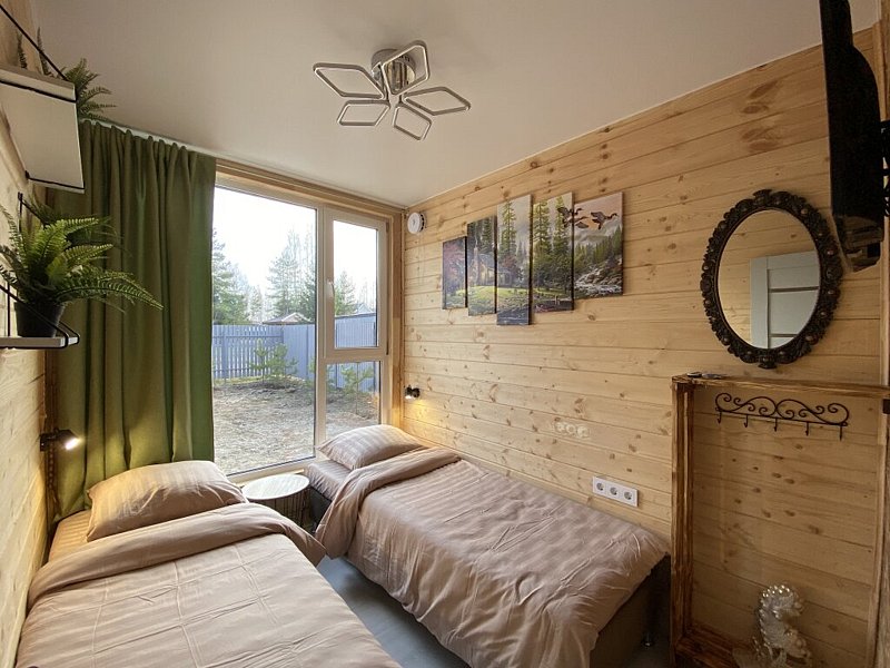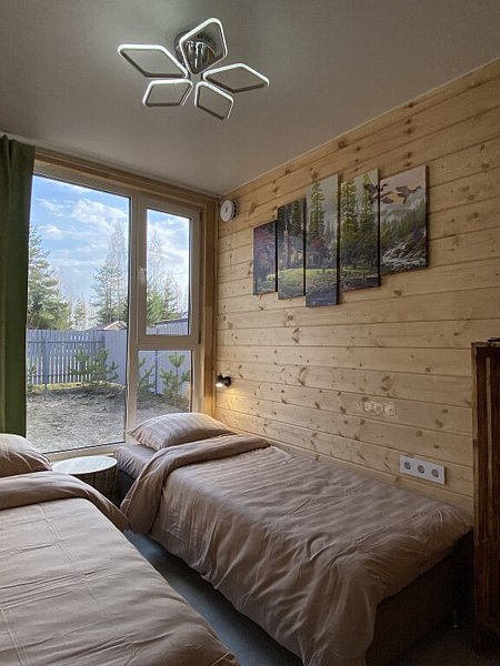 На первом этаже: 2 отдельные комнаты отдыха (в одной – двуспальная кровать, в другой - две односпальные кровати (спринг боксы). На втором этаже: банный комплекс с роскошной террасой и креслами Кентукки, комната отдыха с панорамным окном (она же и комната для проживания 2-х человек: двуспальная кровать).