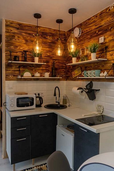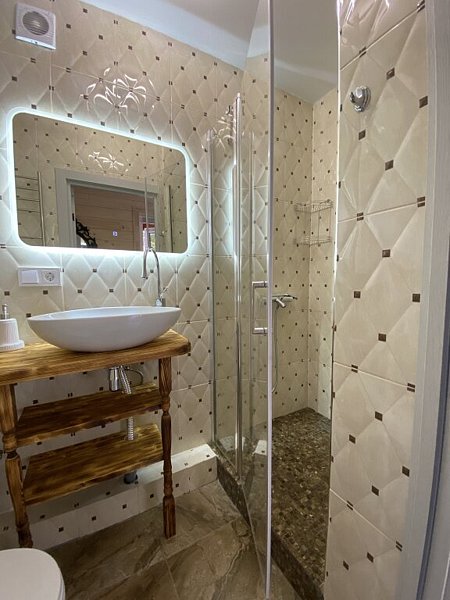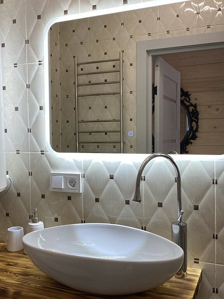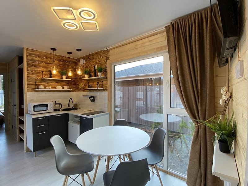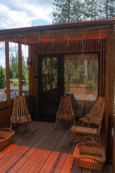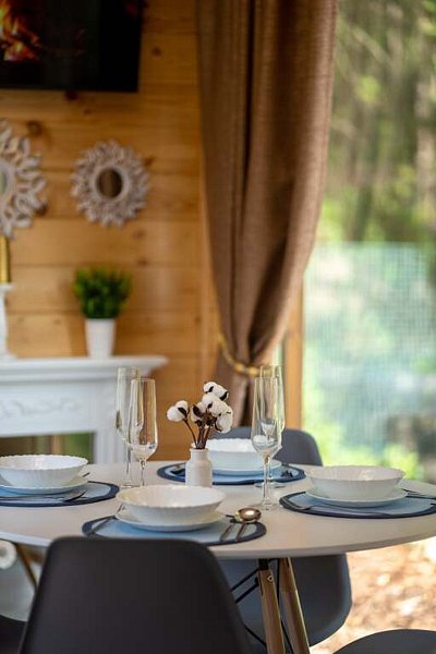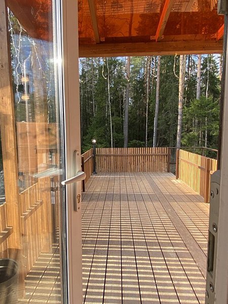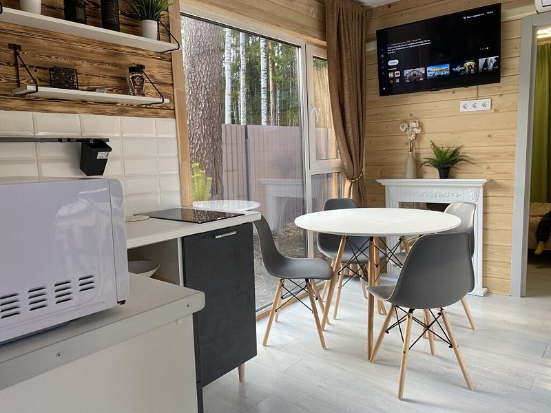 В доме есть все необходимое для комфортного проживания: микроволновая печь, 2-х конфорочная индукционная плита, кондиционер, холодильник. Огромная терраса на 2-м этаже с креслами-шезлонгами и шикарным видом на лес.