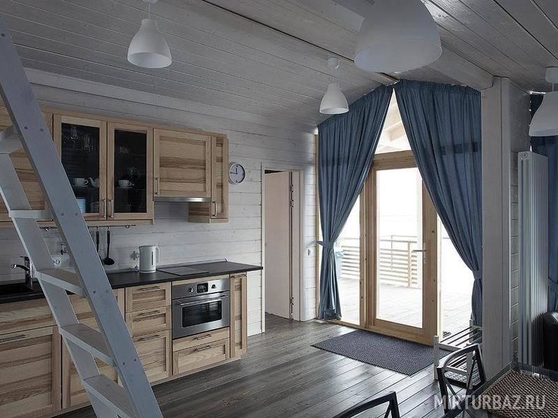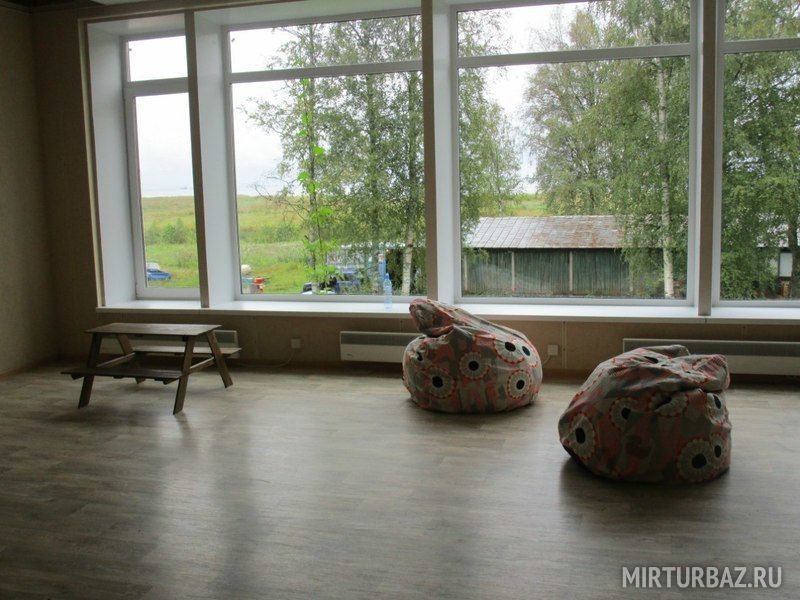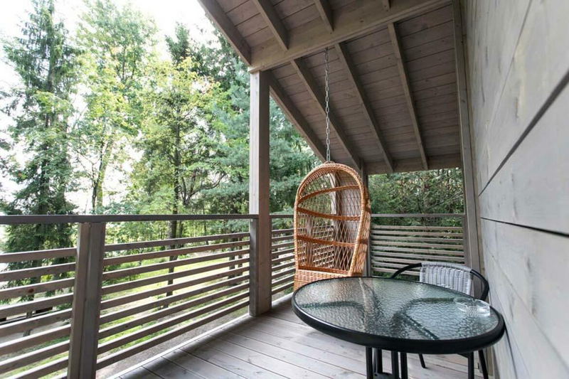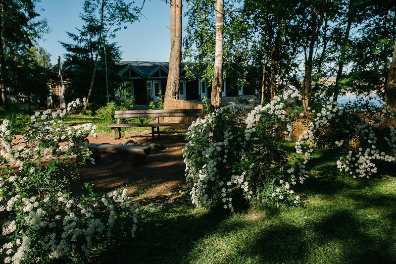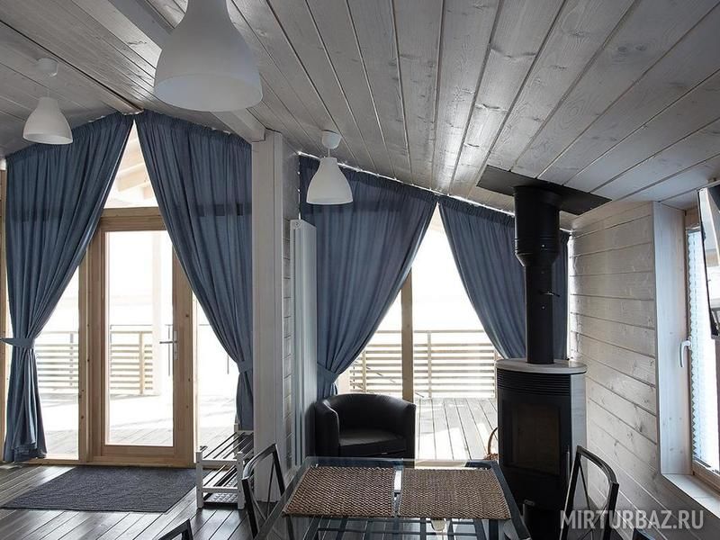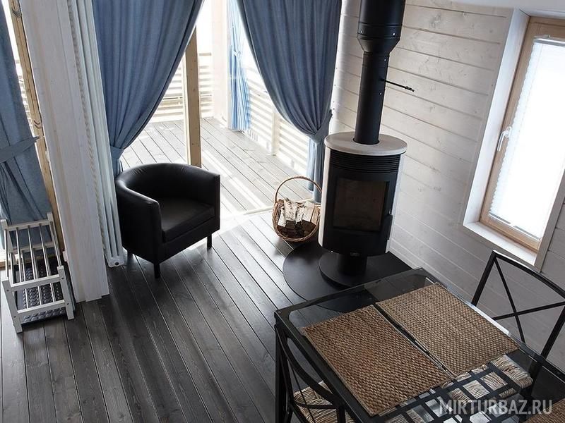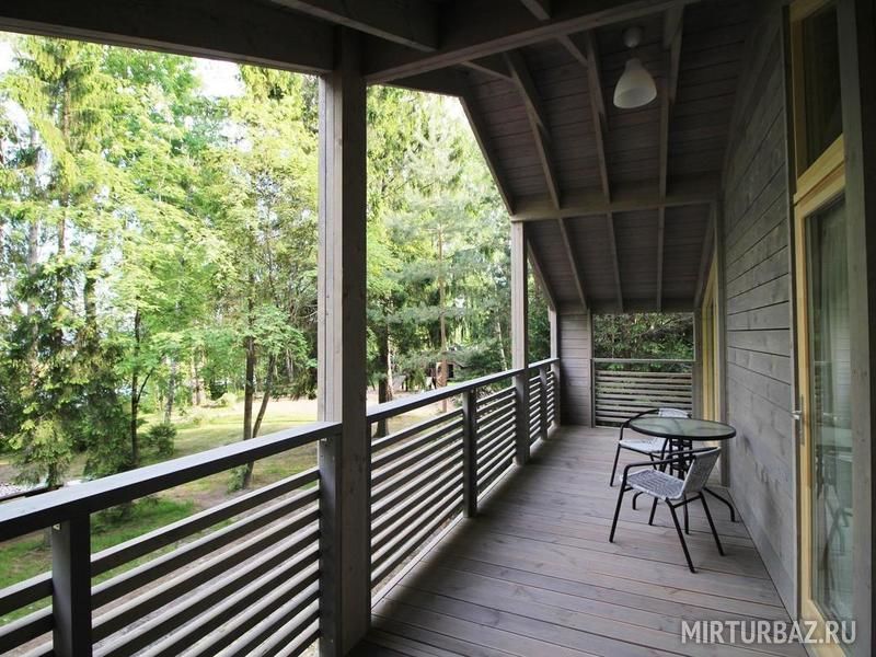 Каждый номер имеет отдельный вход и крытую террасу перед ним. На ней можно с комфортном разместиться в шезлонгах и выпить утренний кофе, наблюдая гладь Ладожского озера.