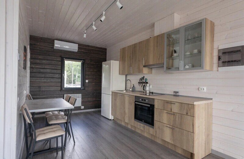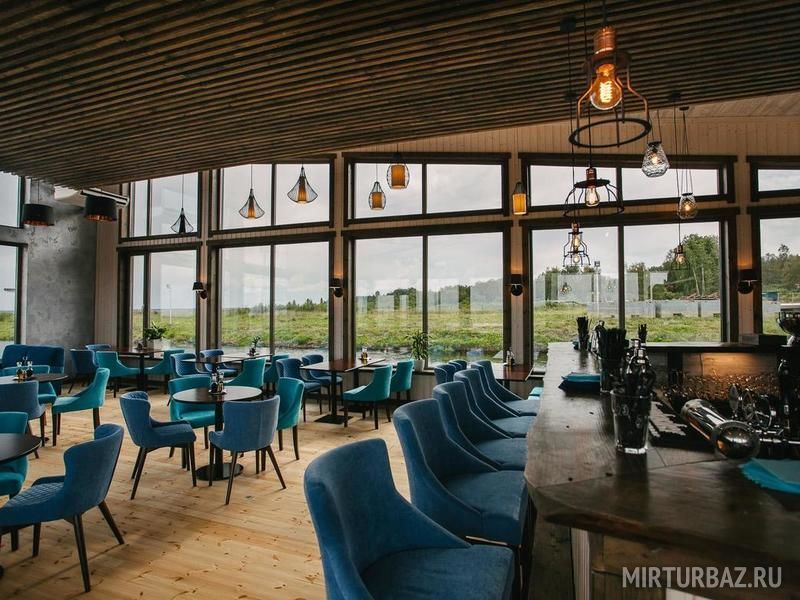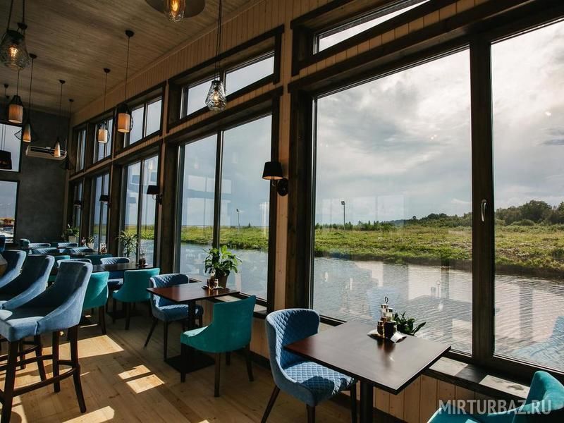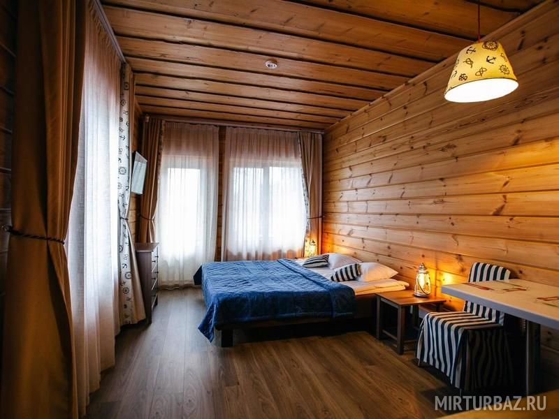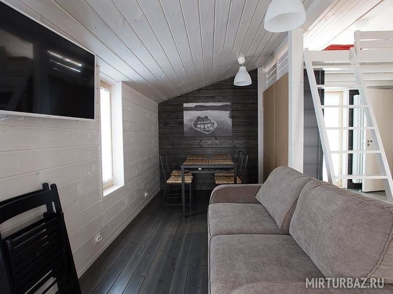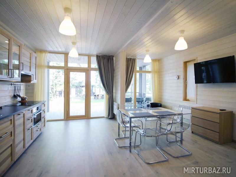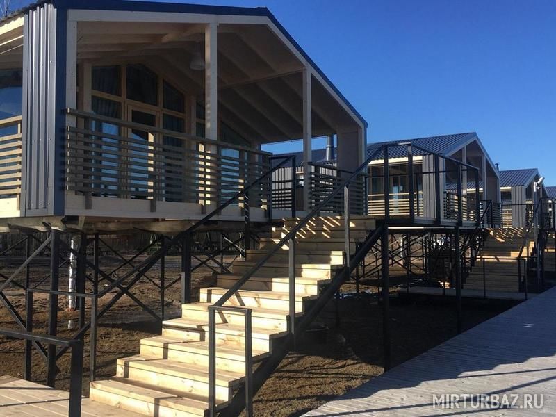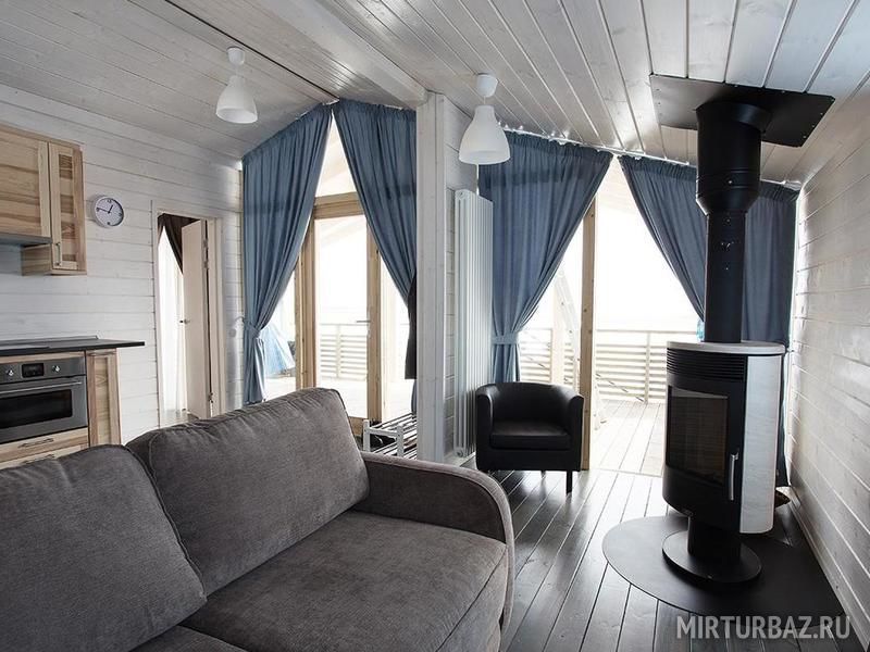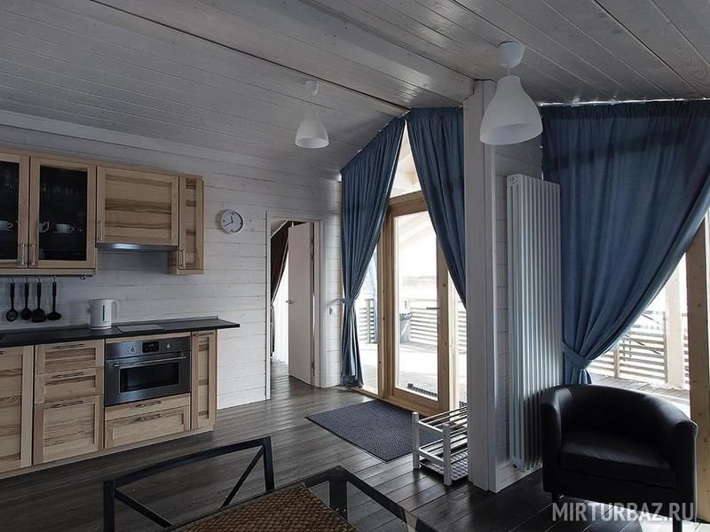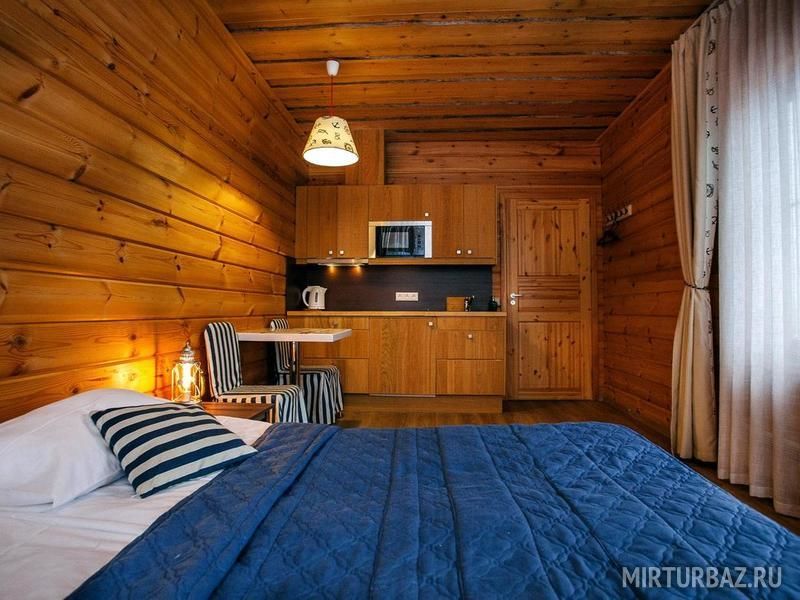 Останавливались в коттедже Бунгало. Просторный и уютный домик для семьи, парковка прям у домика, большая кухня-гостиная со всем необходимым и камином(с запасом дров), в ванной стиральная машина, отдельная спальня для взрослых и кровать под потолком для детей. На веранде качалка и удобные стулья с видом на марину. Территория небольшая, но есть где погулять, рядом с домиками мангальная зона, а совсем рядом веревочный парк с тролеем и ферма с контактным зоопарком и лошадьми. С чт. по вск. работает ресторан, из которого можно заказать доставку в номер или же посидеть там, ресторан дог френдли.