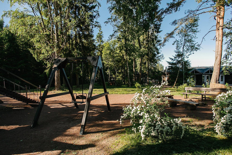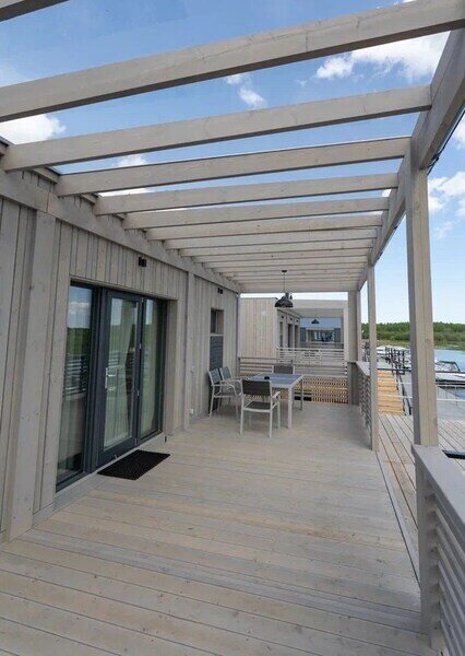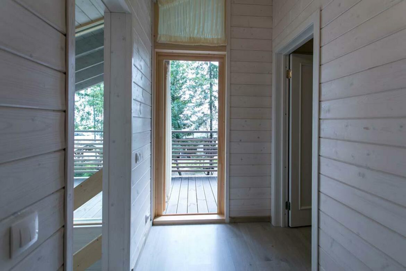 Каждый дом имеет крытую террасу с летней мебелью, качелью-гамаком. Также, на террасе можно с комфортном разместиться в шезлонгах и выпить утренний кофе, наблюдая гладь Ладожского озера.