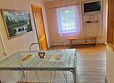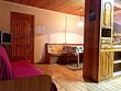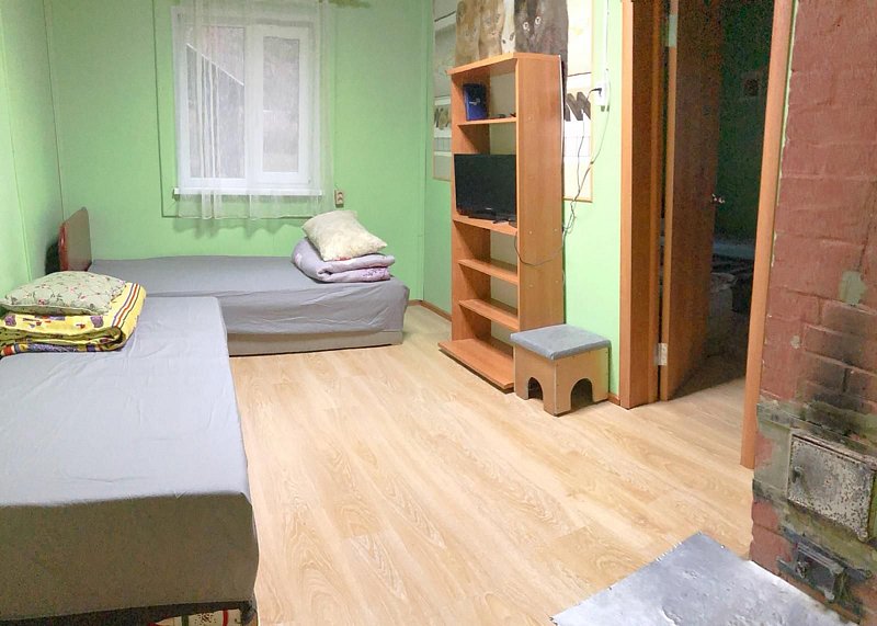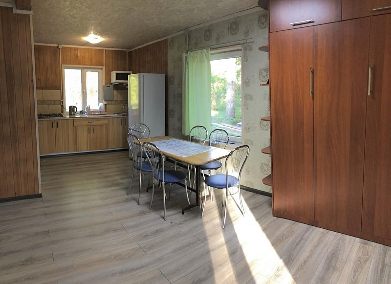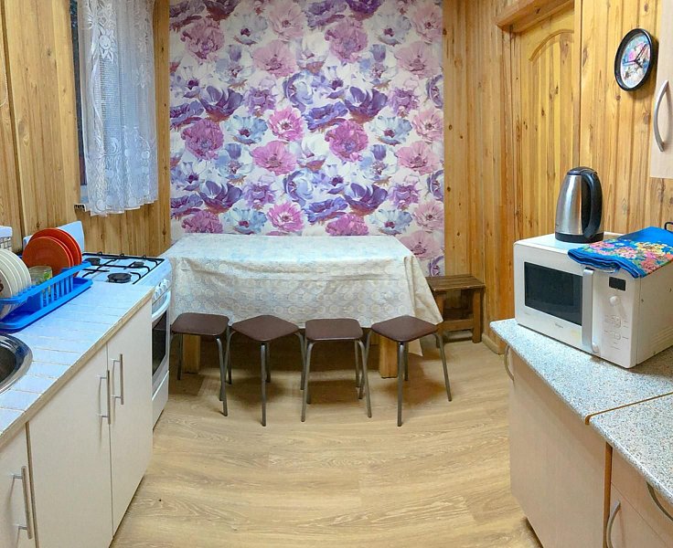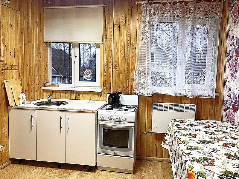 В вашем распоряжении спальня, гостиная совмещённая с кухней, санузел с душевой. Обогревание электрическое, есть холодная и горячая вода, телевизор в обеденной зоне (спутниковое), на кухне есть весь необходимый инвентарь: большой обеденный стол, посуда, микроволновка, электр. чайник, газовая плита, холодильник. Размещение: спальня — три односпальные кровати, диван в гостиной.