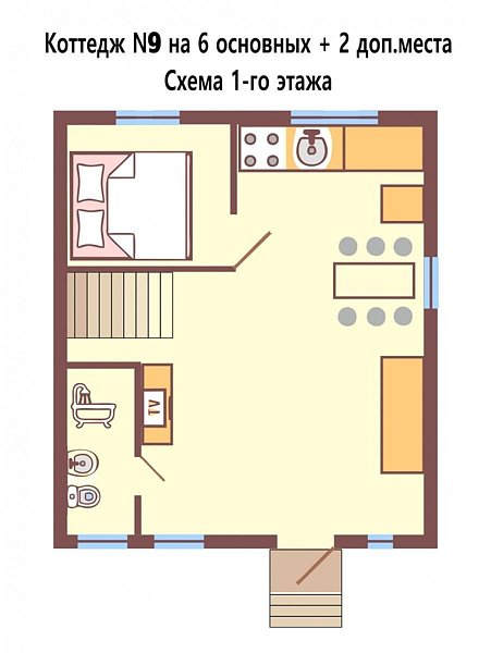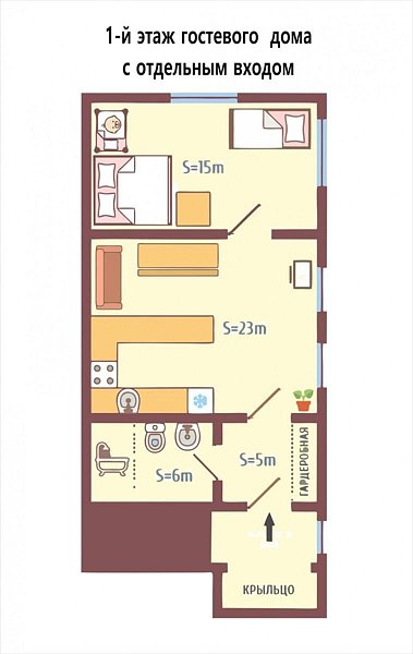 Первый этаж гостевого дома с отдельным входом рассчитан на компанию 3-4 человека, площадью 50 м кв - просторная однокомнатная квартира.