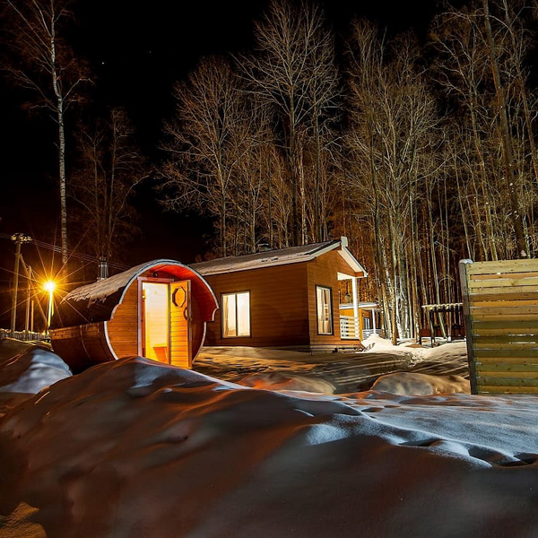В домиках есть все необходимое для комфортного проживания: двуспальные кровати, душ и туалет, диван в гостиной, оборудованная кухня и печь на дровах с настоящим живым огнем. Каждый домик оснащен мангальной зоной с принадлежностями для барбекю.