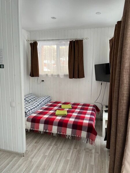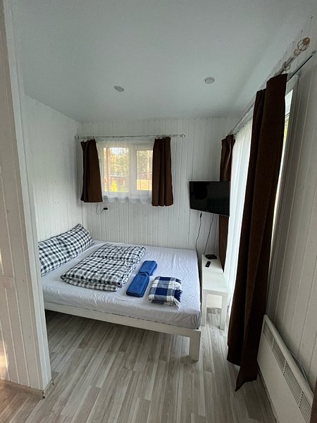 В номере: одна двуспальная кровать, один двуспальный диван, печь, оборудованная кухня, холодильник, телевизор, постельное белье, вся необходимая посуда, душ/туалет.