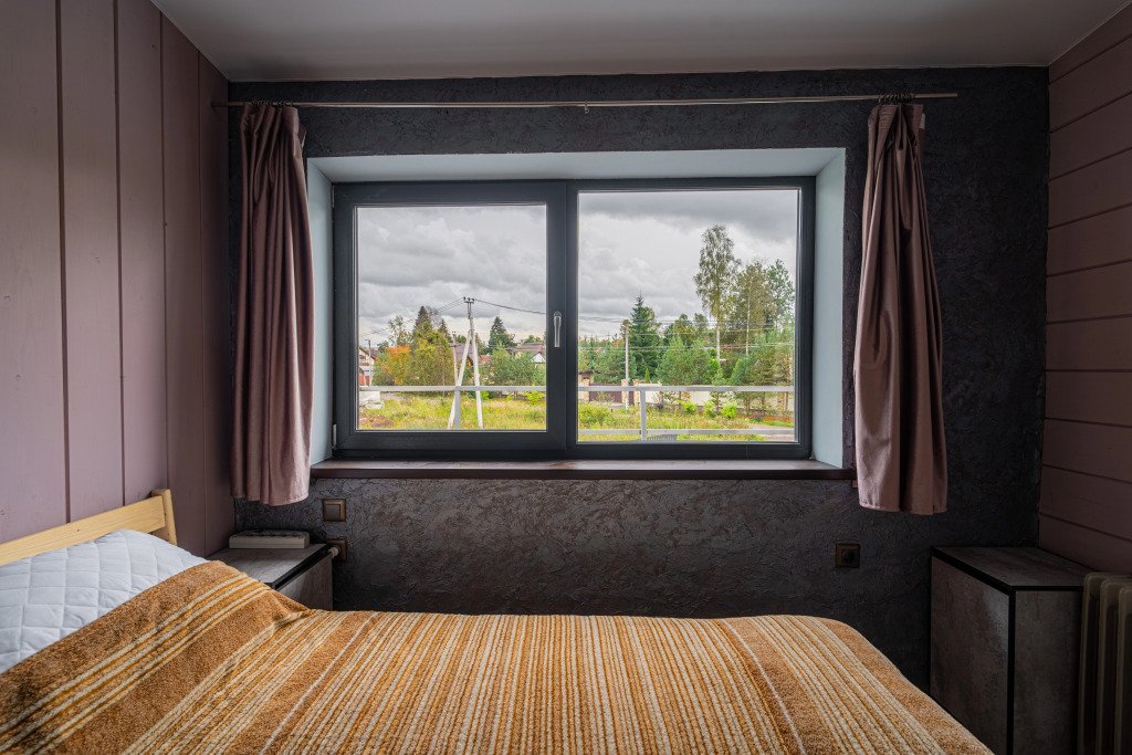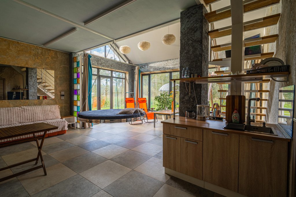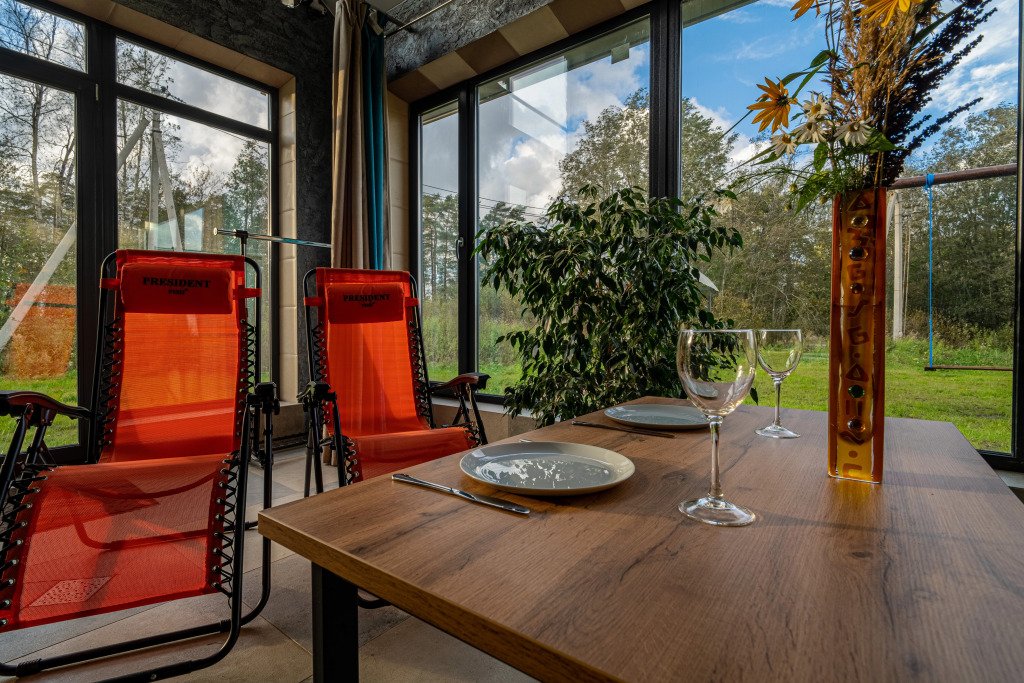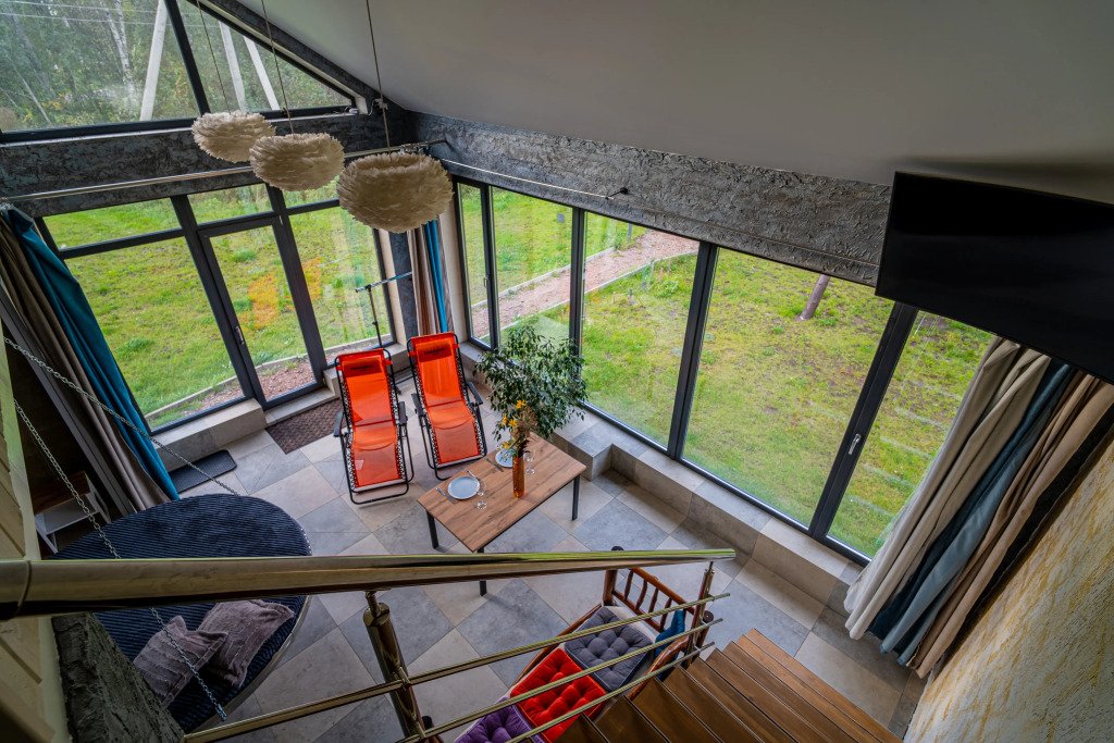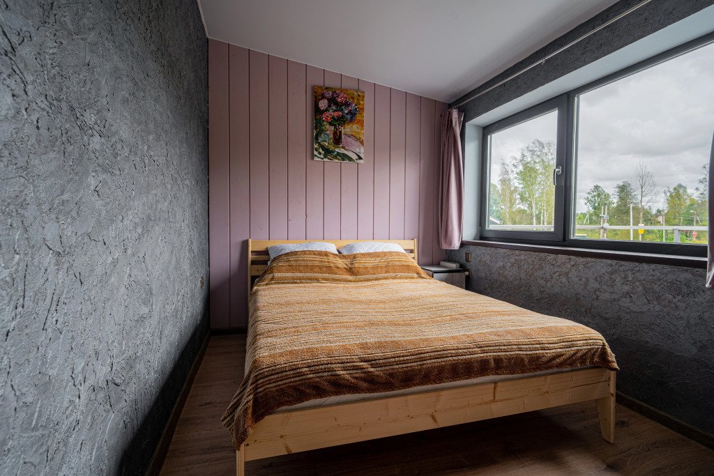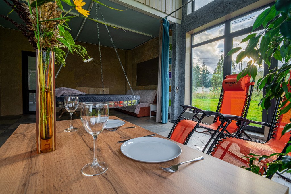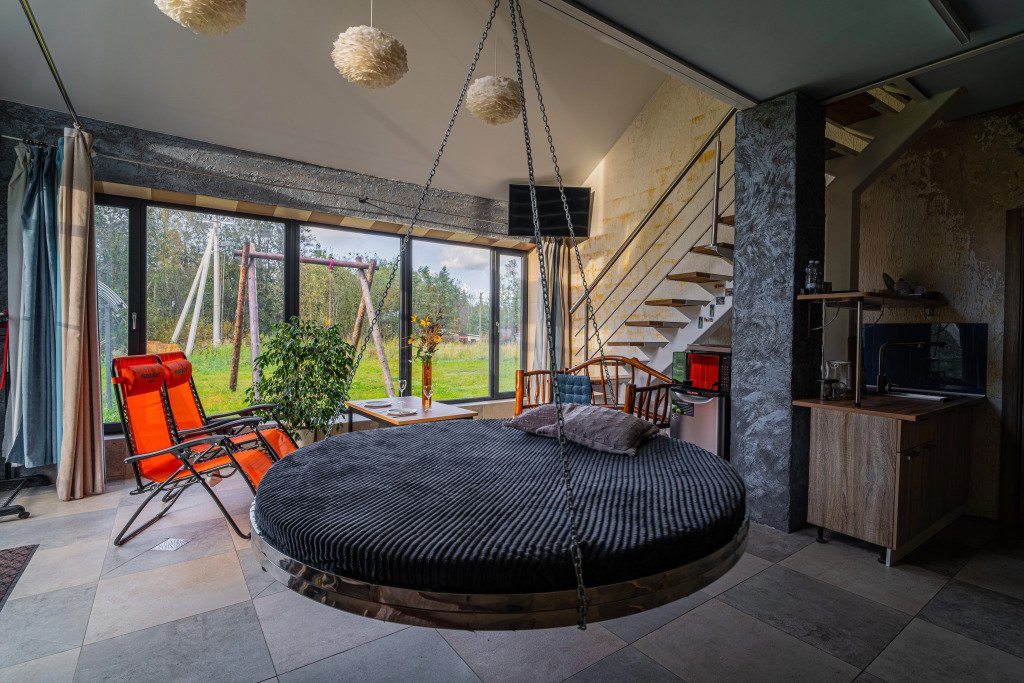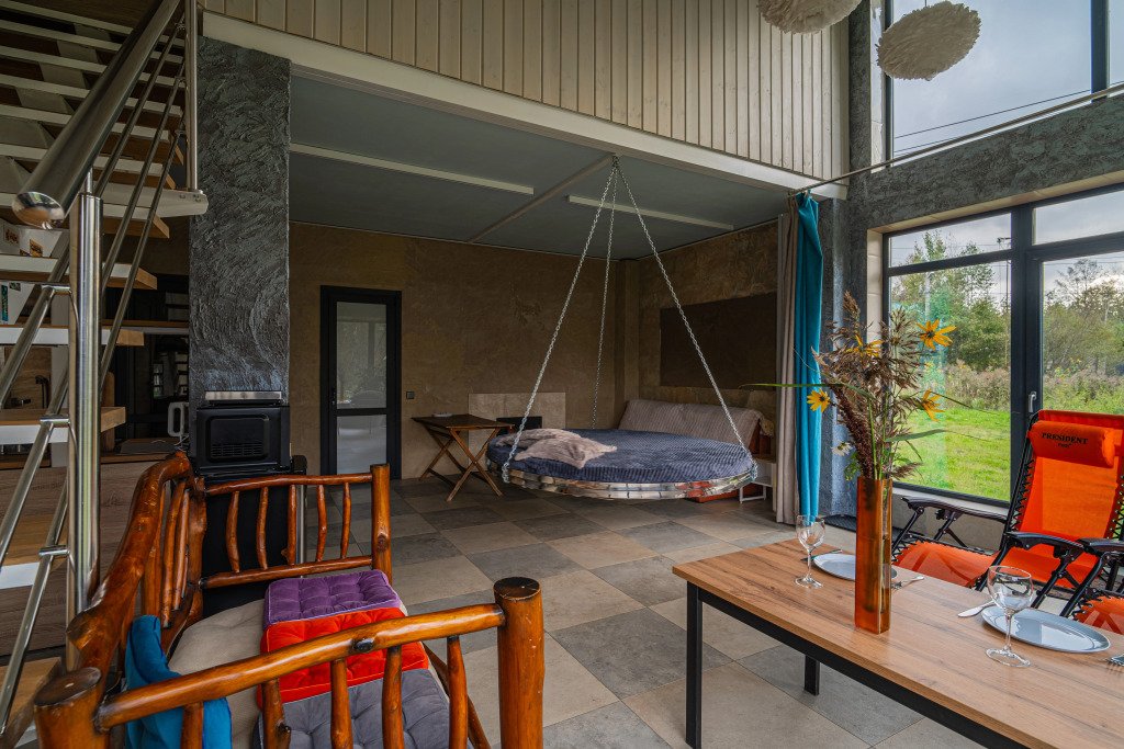 Гостям предлагается коттедж с баней. Для комфорта гостей: комната отдыха с камином, раскладным диваном и подвесной кроватью. На втором этаже имеется отдельная спальня с двуспальной кроватью. Всего в коттедже 4 спальных места.