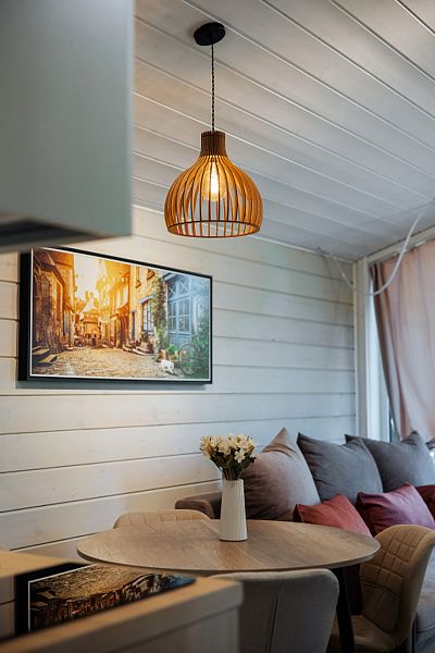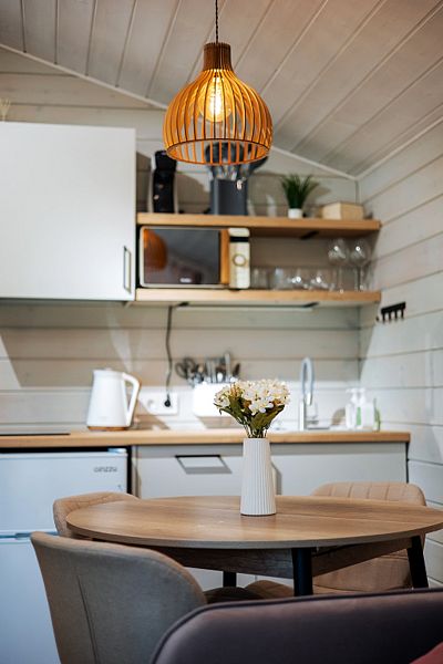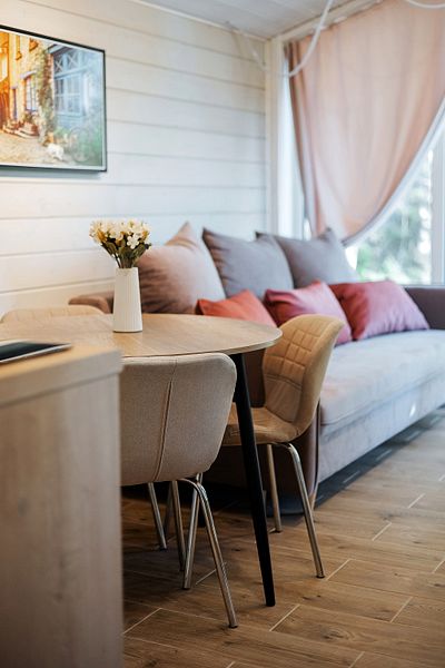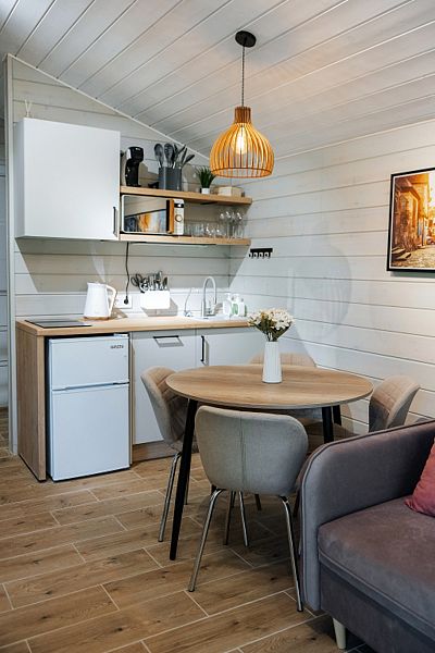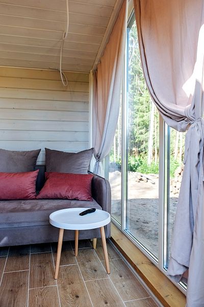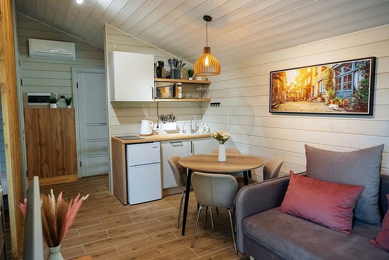 Коттедж с двумя спальнями, кухней-гостиной и открытой верандой, где можно посидеть на свежем воздухе. Есть все удобства для комфортного проживания и отдыха.
