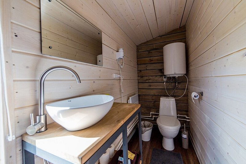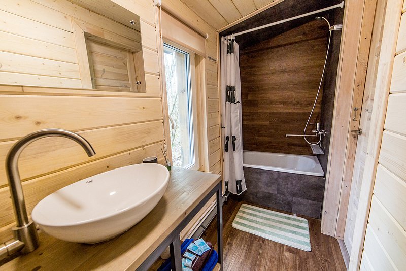 Кухонная зона оборудована плитой, чайником, холодильником, микроволновой печью. В коттедже - конвекторы. Ванная комната с душем и раковиной. На просторной террасе приятно отдыхать и наблюдать за красотами природы.