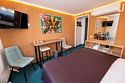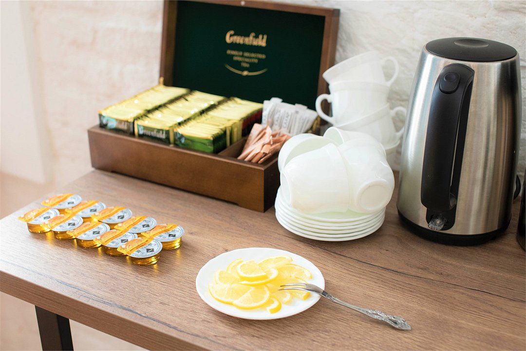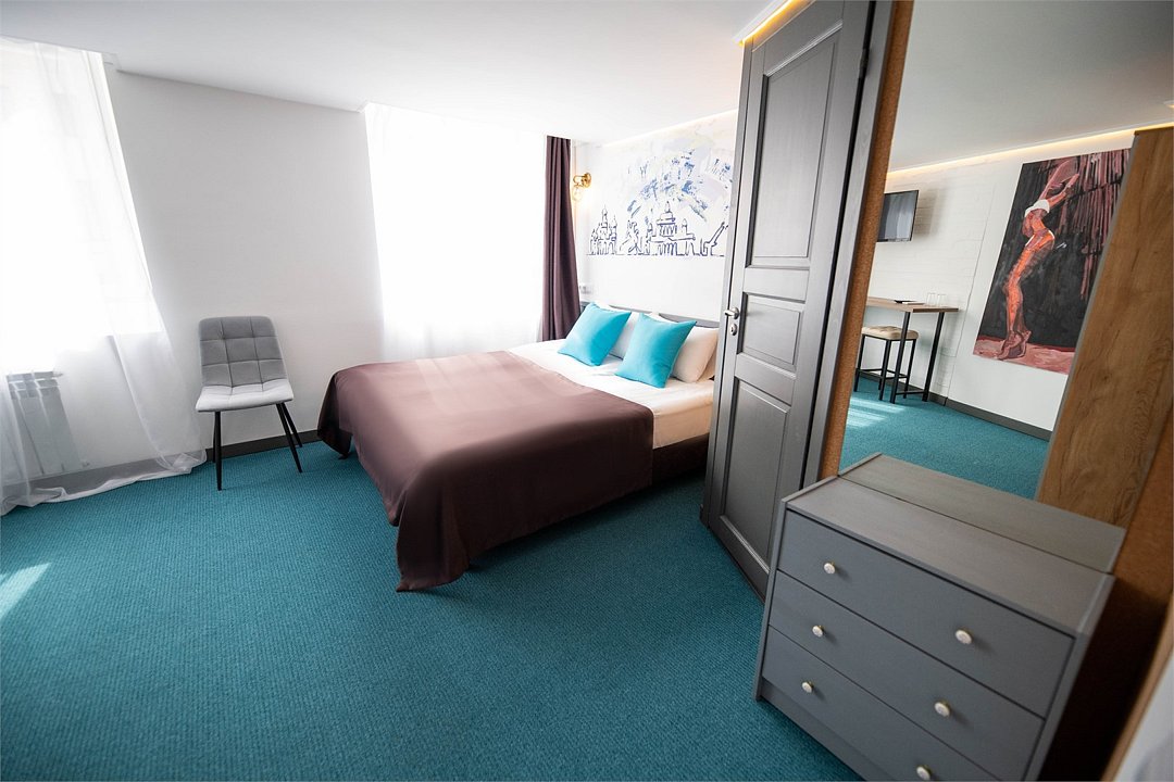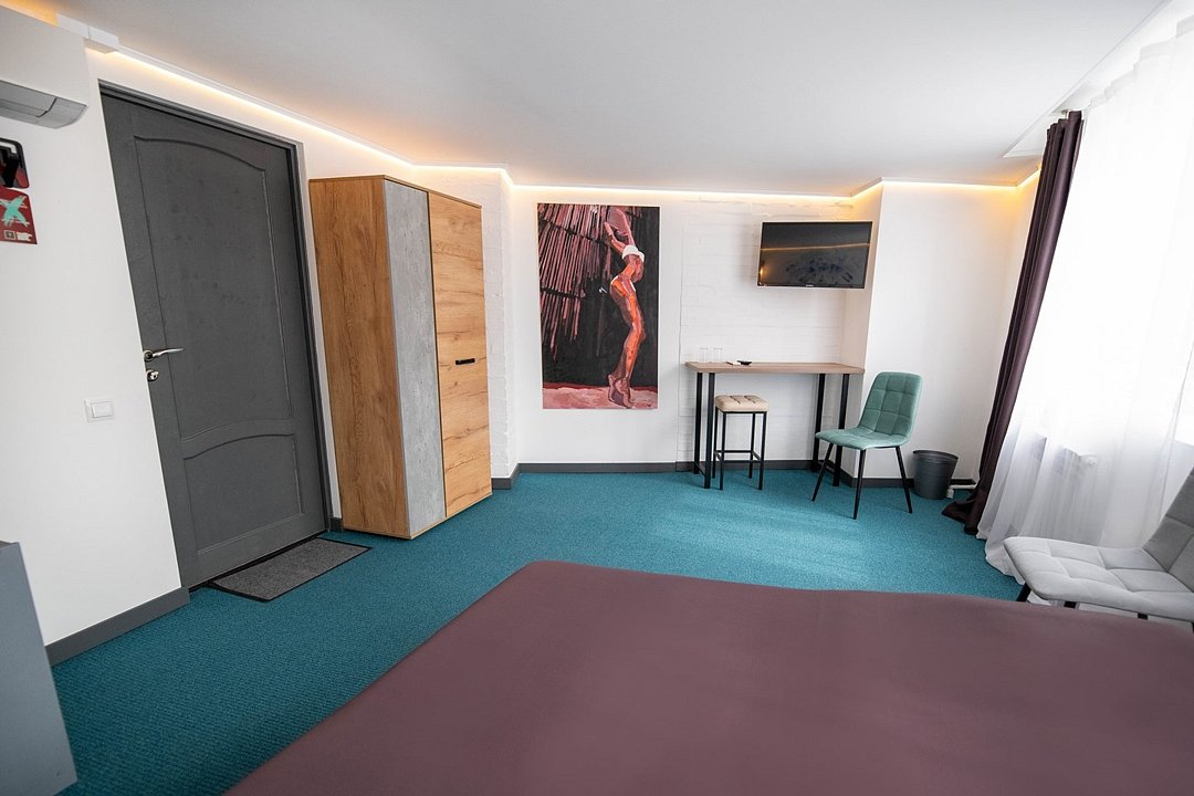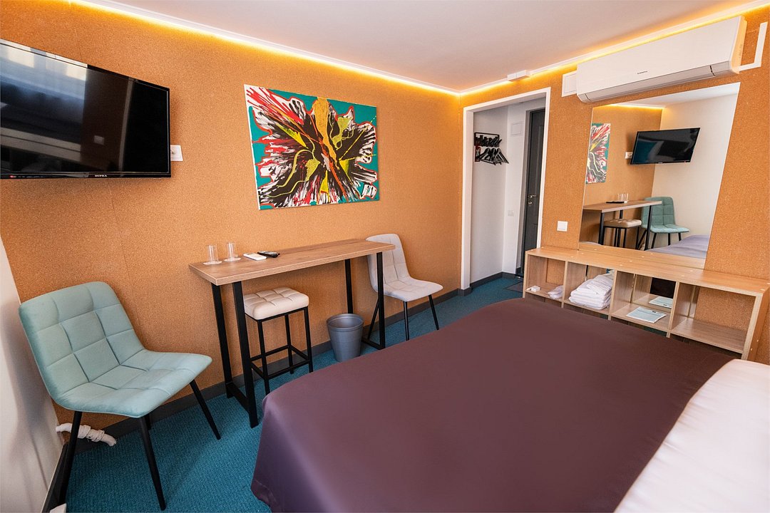 Wi-Fi, кондиционер, светильник, фен, утюг, ванная комната, душевая кабина, банные принадлежности, халаты, банные полотенца, тапочки, косметические средства, кровать «Queen size», гладильная доска, тумбы, гардеробная, вешалки, зеркало, обслуживание номеров, информационная карта, меню, унитаз, раковина, питьевая вода, отопление, душ, вид на город, кулер на этаже, паркет, стаканы, стул, туалетные средства, мини-холодильник, телевизор со Smart TV, номер для некурящих, шапочка для душа, мыло, можно с питомцамиВ апартаментах