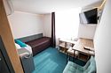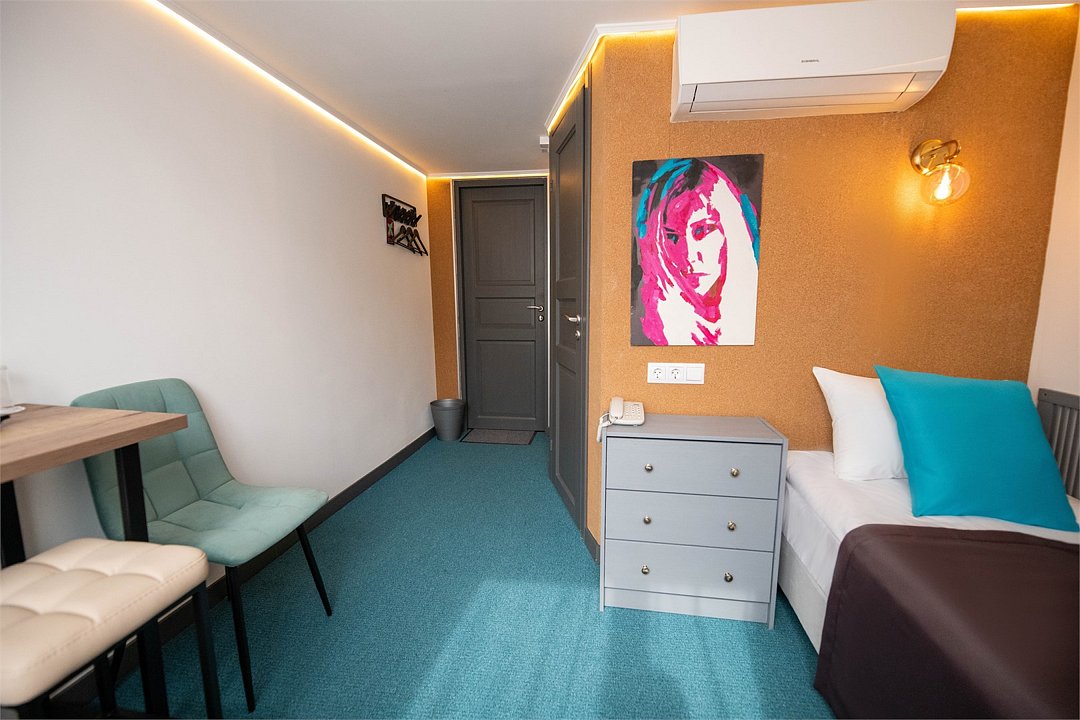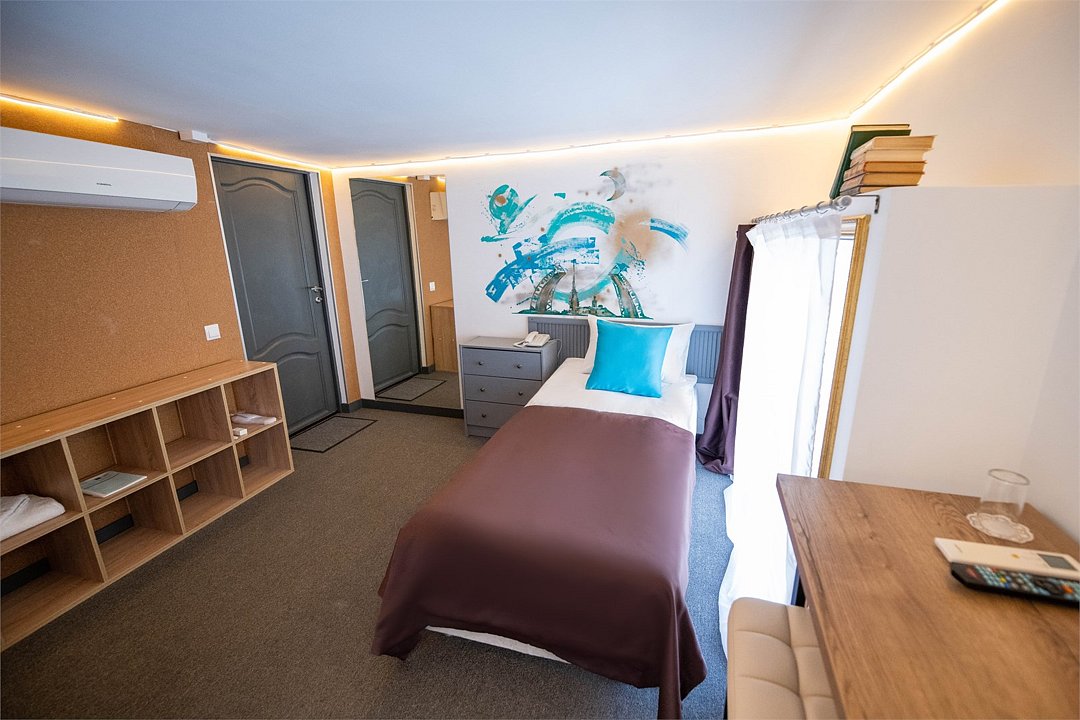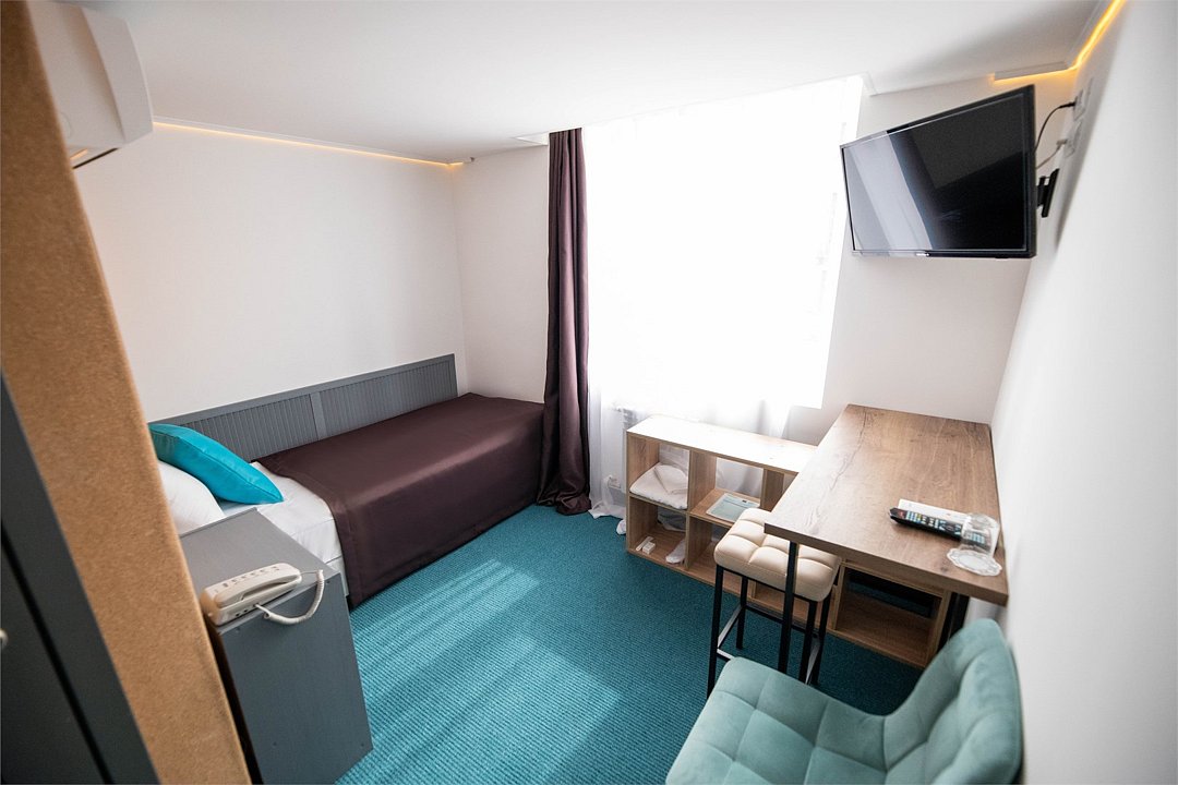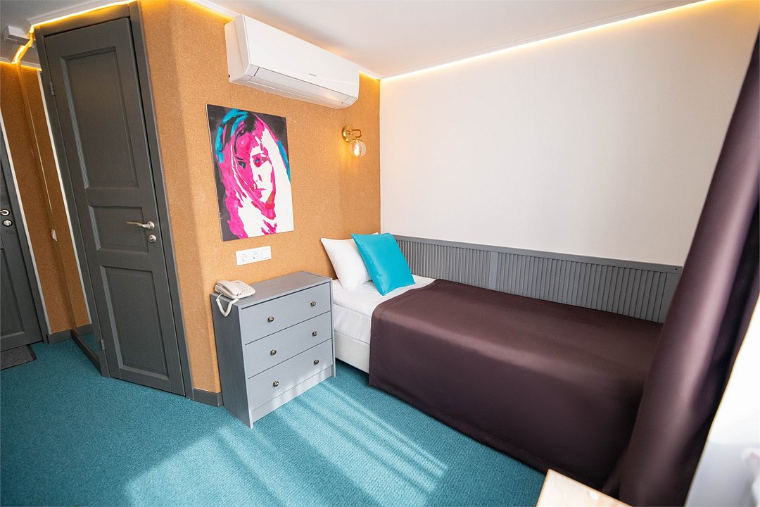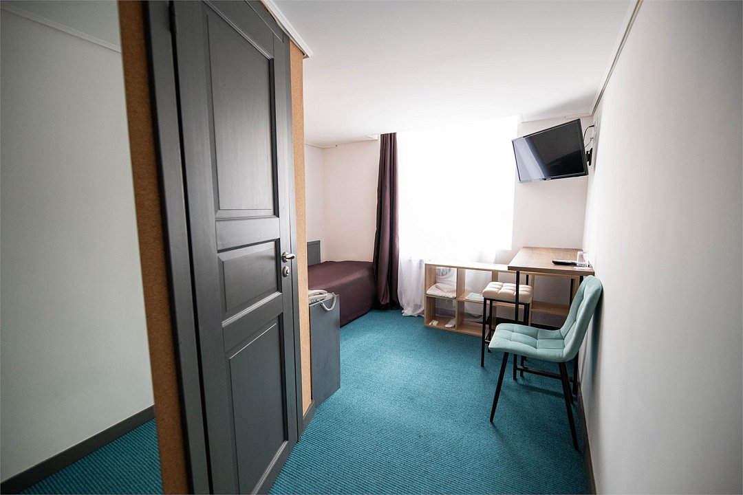 Wi-Fi, телефон, кондиционер, светильник, настольные лампы, фен, утюг, душевая кабина, санузел, банные принадлежности, банные полотенца, тапочки, косметические средства, односпальная кровать, гладильная доска, тумбы, стулья, вешалки, зеркало, ковер, унитаз, раковина, питьевая вода, ковровое покрытие, отопление, душ, вид на город, кулер на этаже, стаканы, стол, туалетные средства, цифровое тв, телевизор с плоским экраном, телевизор со Smart TV, можно с питомцамиВ апартаментах