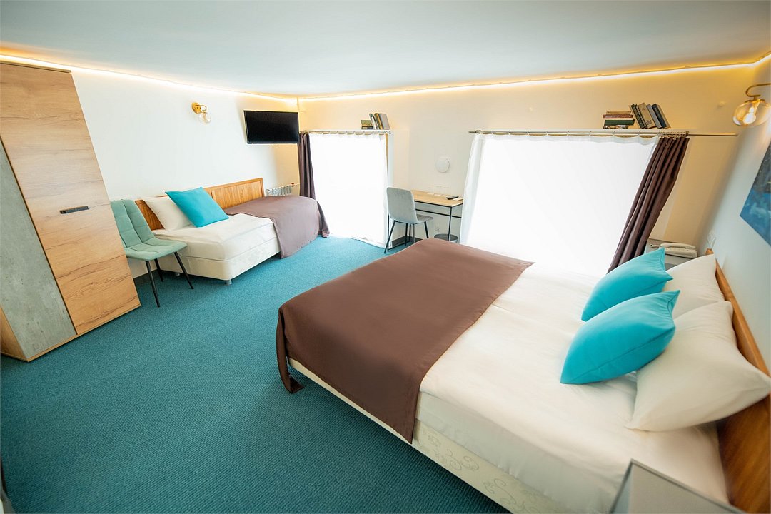 двуспальная и 1-но спальная кровати, с/у, душ, ТВ, кондиционер, высота потолка 195-210 см!