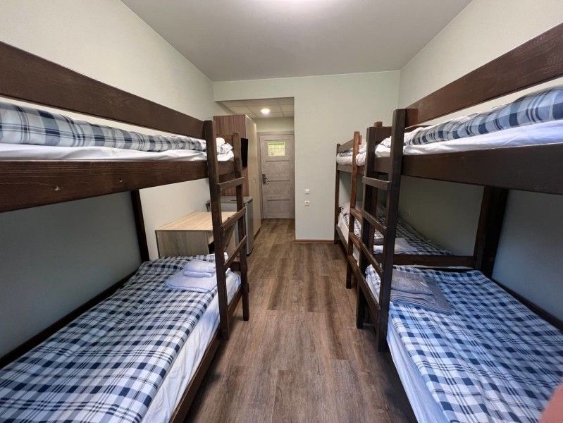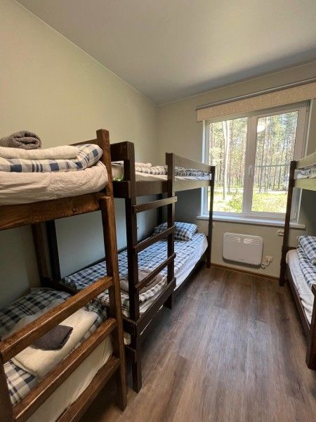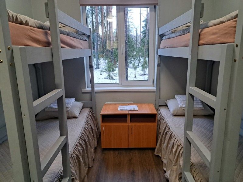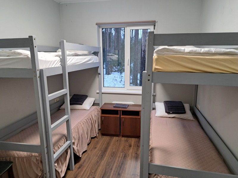 Две большие двуспальные кровати из массива сосны, над ними две односпальные.