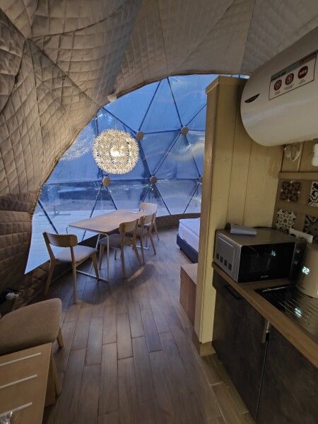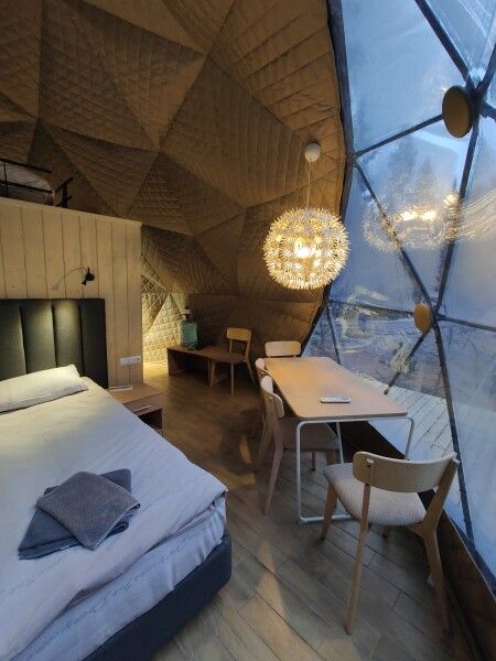 На территории комплекса располагаются 9 деревянных коттеджей. Создатели и архитекторы повторили в них атмосферу уюта и спокойствия, присущую коренному населению региона. Комфортабельные одно- и двухэтажные дома построены из калиброванного бревна. Внутренняя отделка выполнена декоративными деревянными элементами ручной работы. Каждый коттедж оснащен электричеством, горячим и холодным водоснабжением, системой отопления с возможностью регулировки температуры, телевидением, оборудованной кухней и многим другим, необходимым для комфортного отдыха.