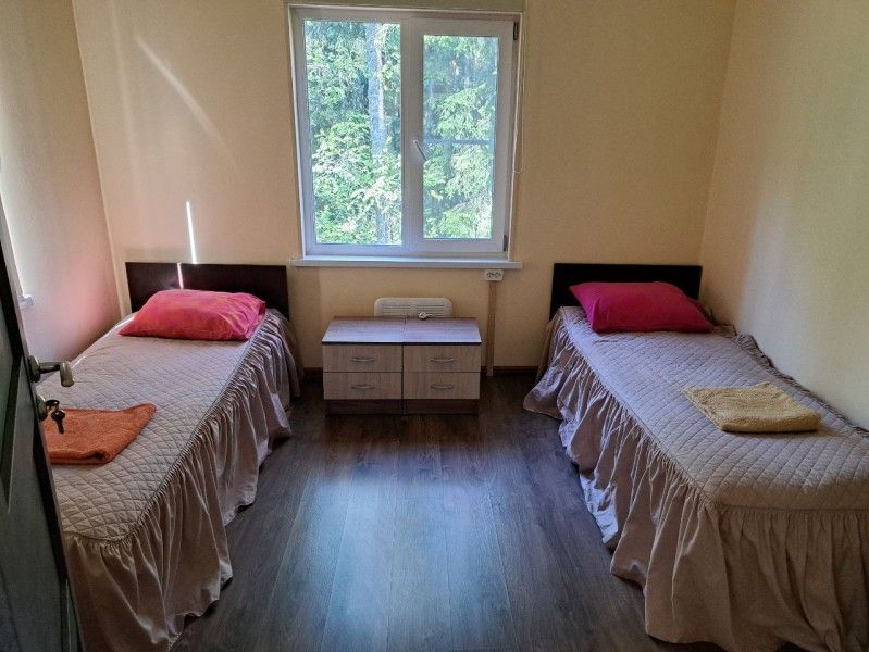 2 этаж: спальня (две односпальных кровати из массива сосны), мини-балкон со спуском во двор.