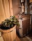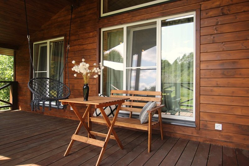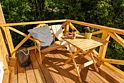 Помимо купели на террасе расположены шкаф, где можно оставить одежду и обувь, два деревянных кресла и небольшой столик. С террасы открывается замечательный вид на лес!