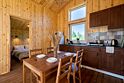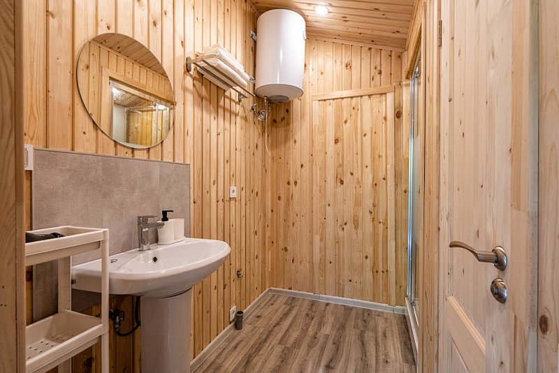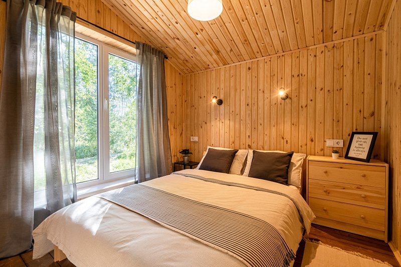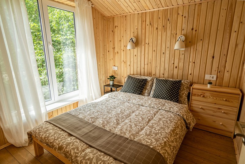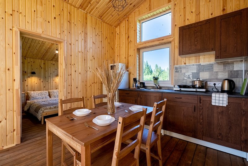 Каждый деревянный домик с двумя спальнями может разместить от 2 до 4 человек. В вашем распоряжении будет вся необходимая мебель, полностью оснащённая кухня, Wi-Fi, а также туалет и душ с горячей и холодной водой. Уютная терраса и мангал позволят вам насладиться отдыхом на свежем воздухе.