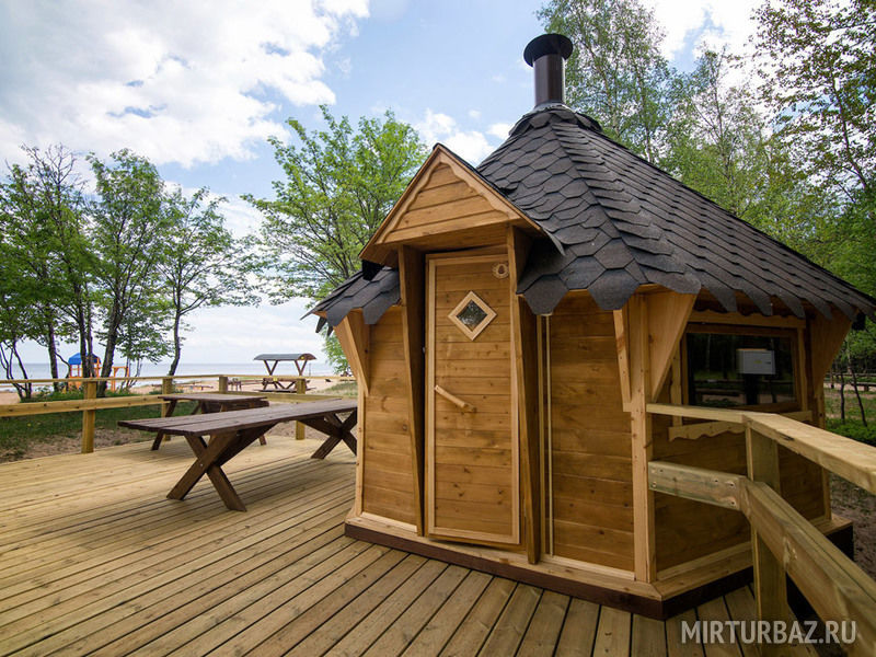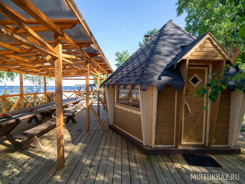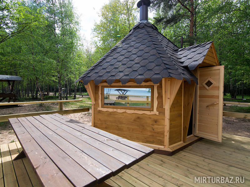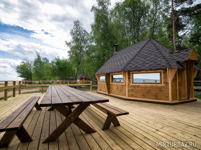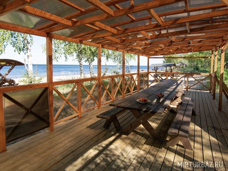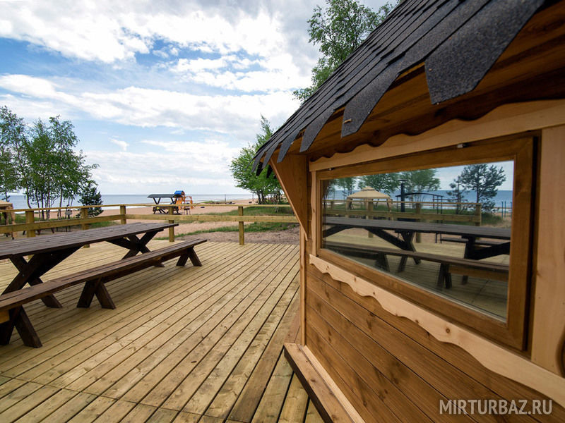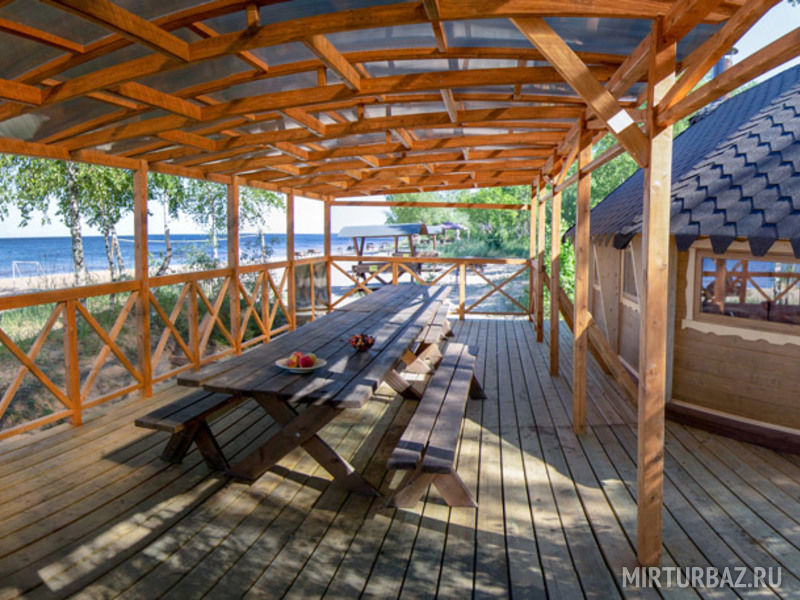 Домик стоит на пляже на широкой деревянной площадке с видом на Ладожское озеро. Комфортная вместительность объекта до 30 человек. Домик отлично подойдет для большой компании. Укроет полностью от непогоды. Внутри оснащен грилем с вытяжкой, столом и стульями. Так же на улице перед домиком в пользование гостям предоставляются столы и скамейки с панорамным видом, расположенные на крытой террасе.