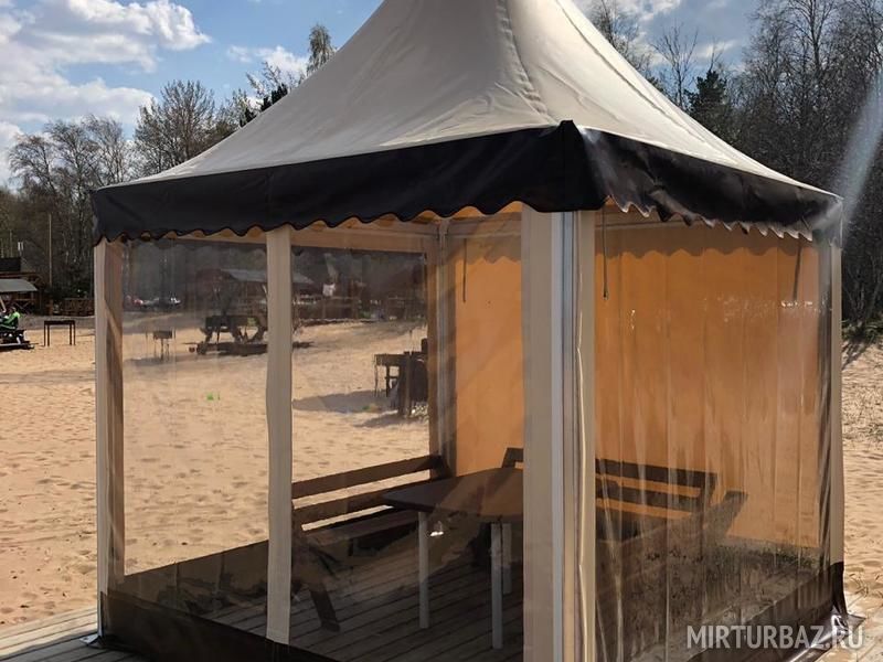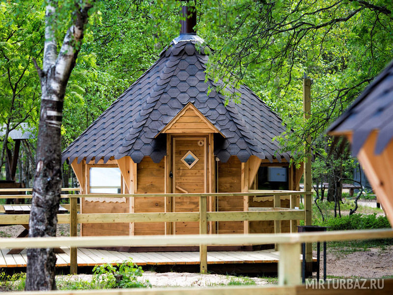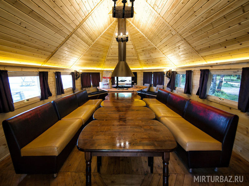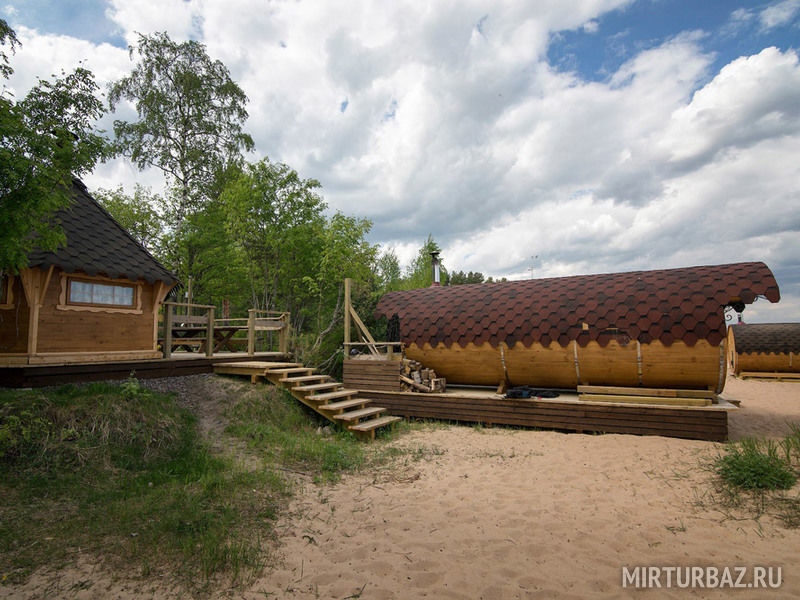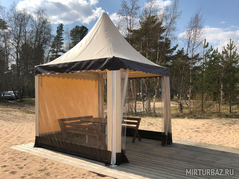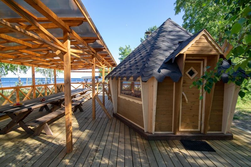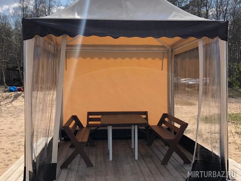 Шатер расположен на берегу озера и вмещает компании до 6 человек. Укроет от дождя и ветра при непогоде. Установлен на деревянной площадке. Из шатра открывается красивый панорамный вид на Ладожское озеро. Рядом с шатром в пользование гостям предоставляется мангал.