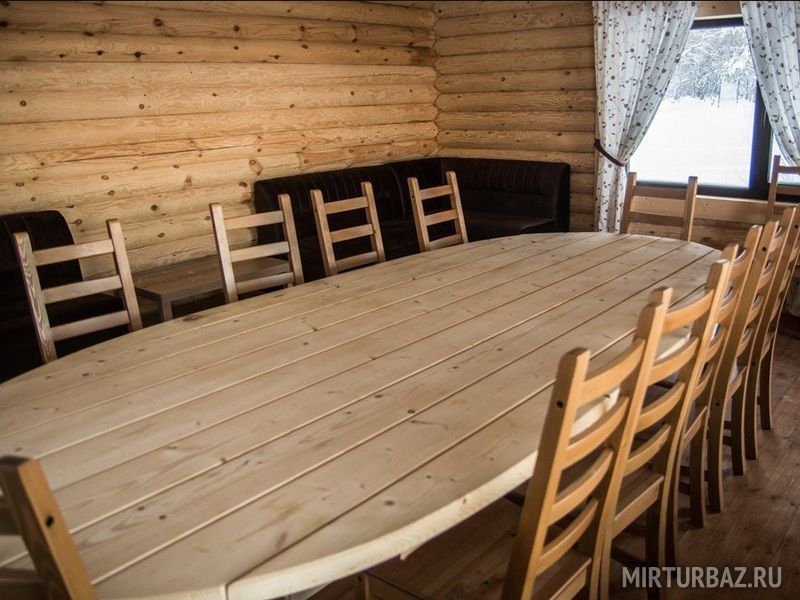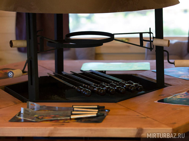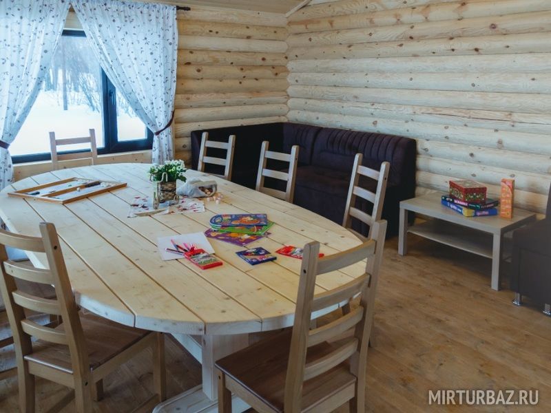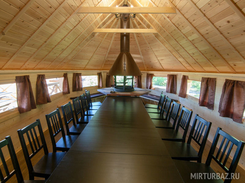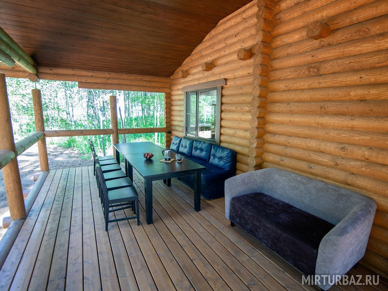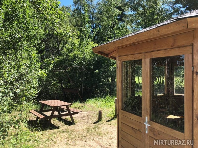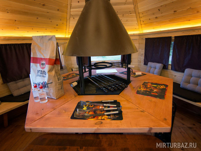 Внутри помещения стоит большой обеденный стол со стульями и 2 небольших дивана. Помещение отапливается электрическим радиатором. В пользование гостям предоставляется открытый мангал, расположенный рядом с верандой.