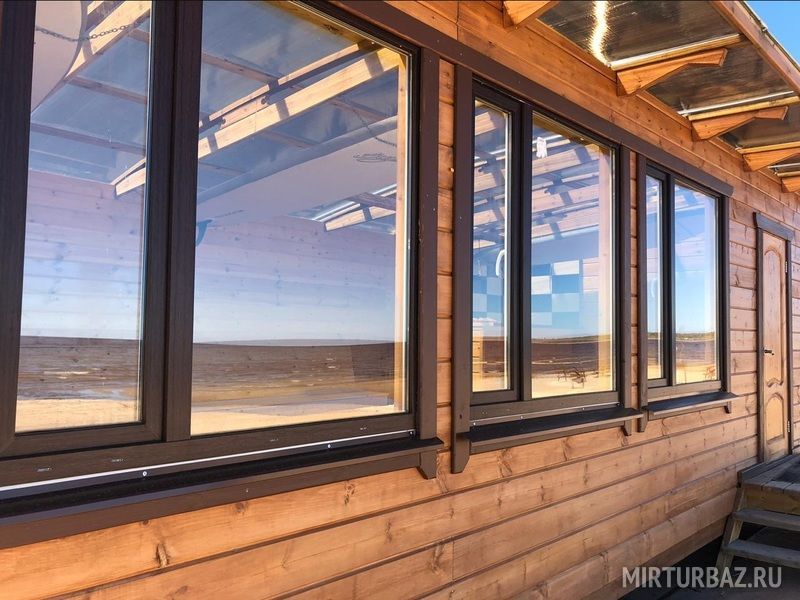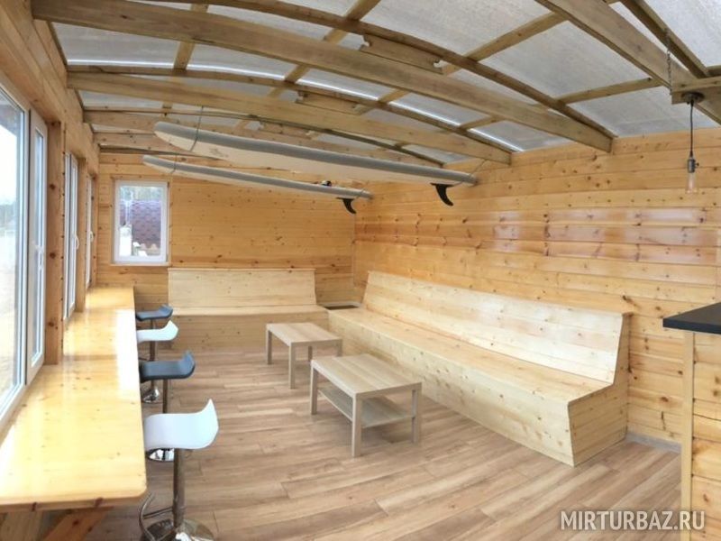 Веранда на пляже, стилизованная под кайтерскую с панорамными окнами и барной стойкой. Подходит для проведения фуршетов и тематических мероприятий для небольших компаний.