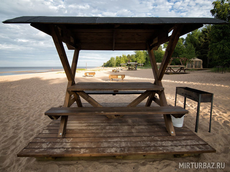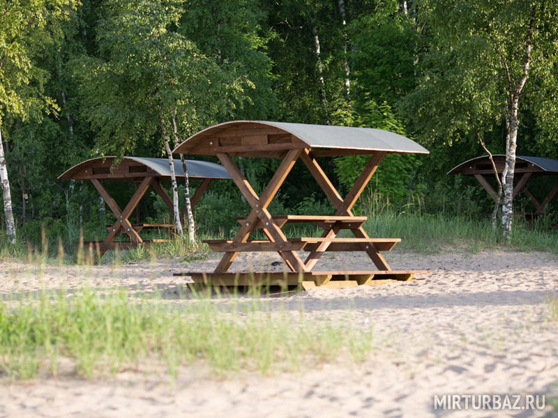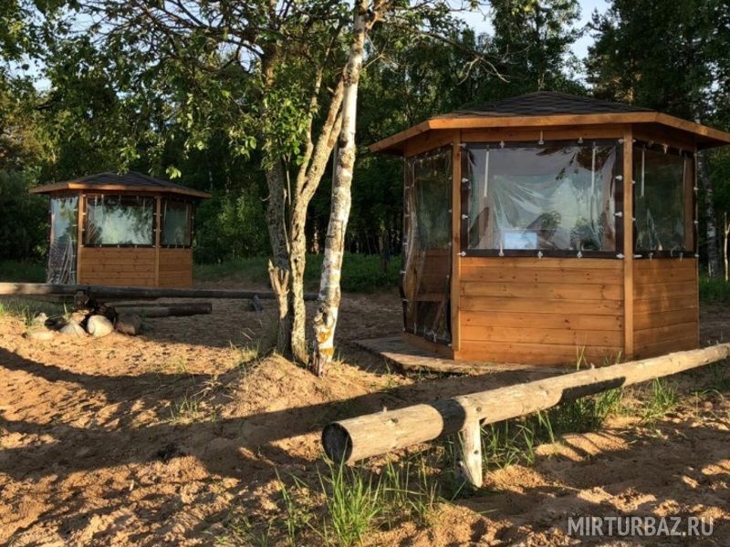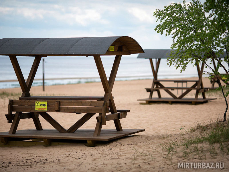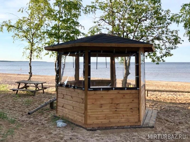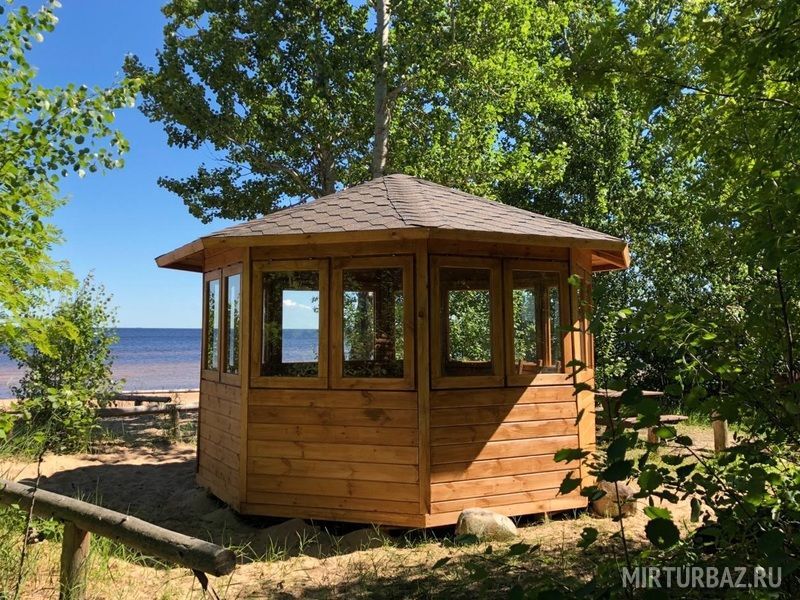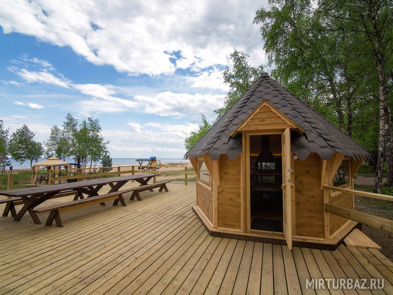 Беседка расположена среди деревьев в дальней части пляжа. Подходит для встречи в кругу семьи или друзей. Рядом с беседкой стоит открытый мангал. Изнутри открывается великолепный вид на Ладожское озеро.