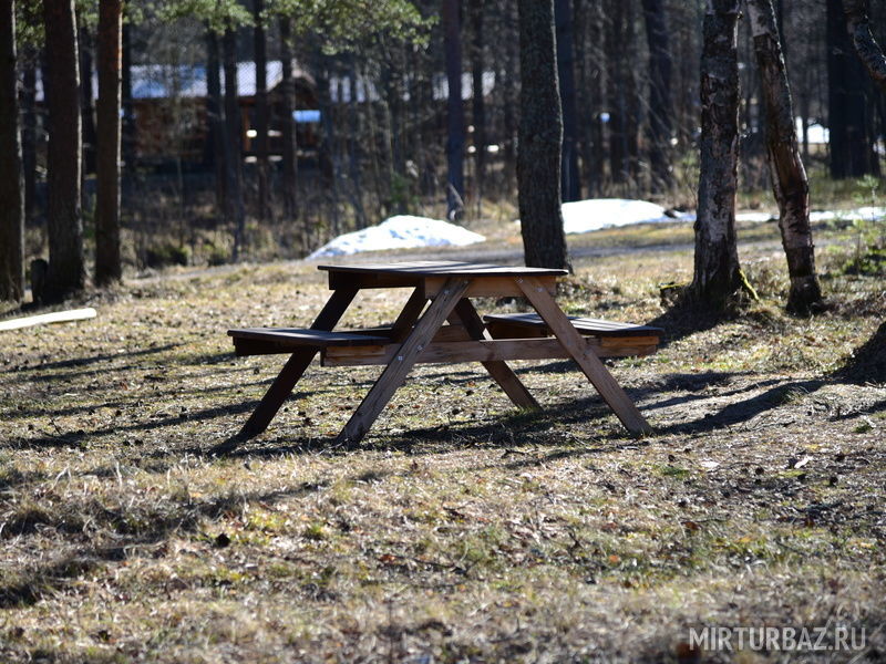Стол на 4 посадочных места расположен на пляже Ладожского озера.