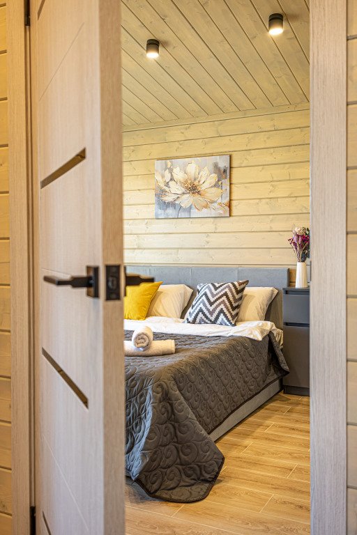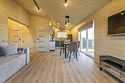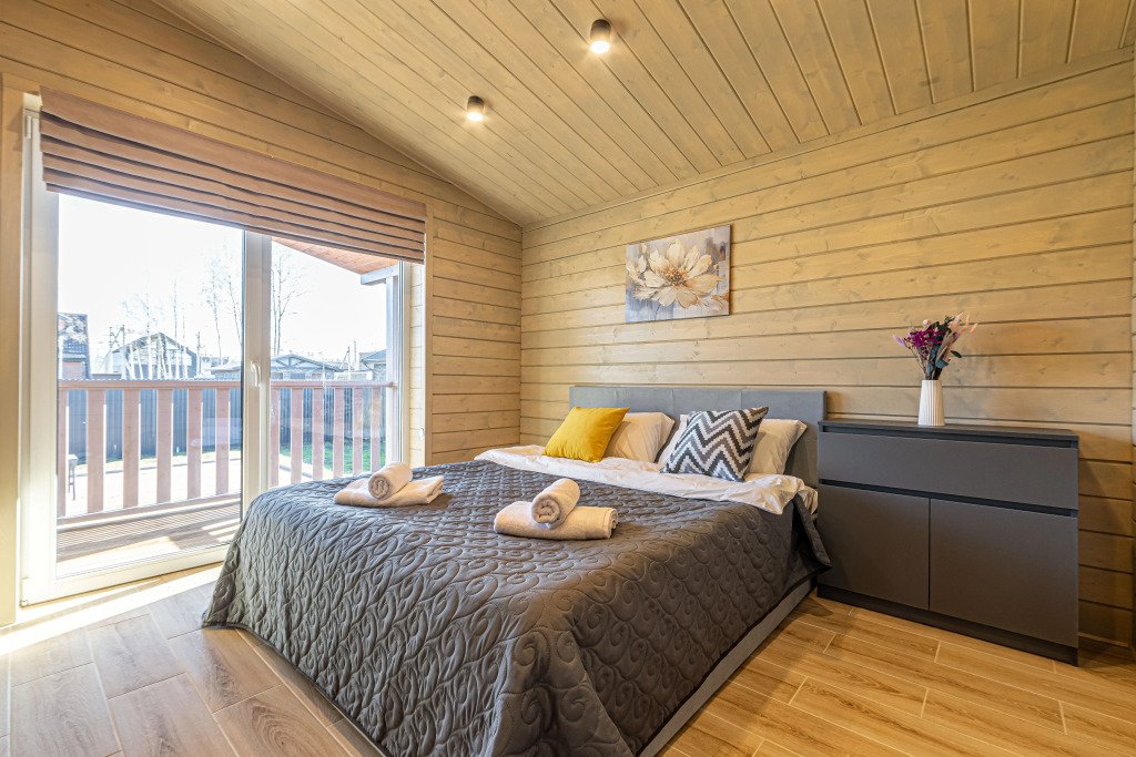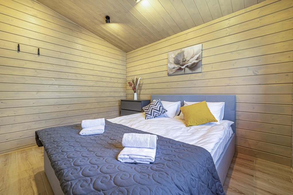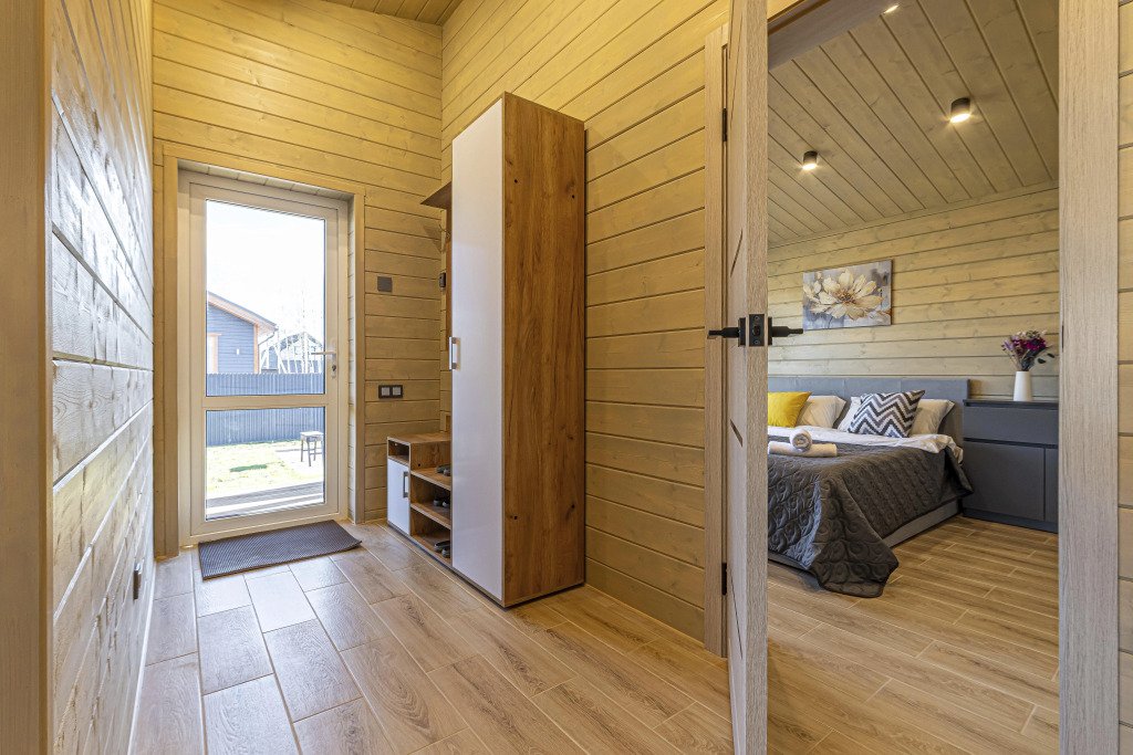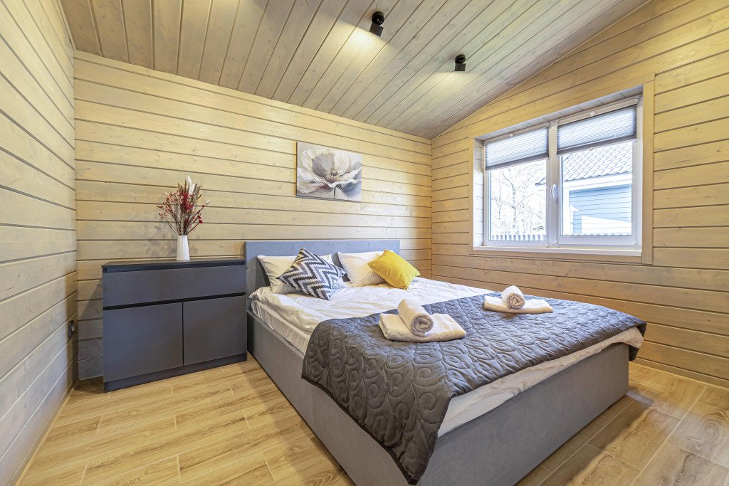 Дом рассчитан на размещение до четырёх гостей и ребёнка. В наличии две спальни, по запросу предоставляется детская кроватка-манеж и стульчик для кормления. Оснащение включает тёплый пол по всему дому, кухню с чайником, посудомоечной машиной, кофемашиной, холодильником и посудой. В доме установлен Smart-телевизор, Wi‑Fi, предоставляются постельное бельё, полотенца, тапочки, гель для душа, шампунь и фен.