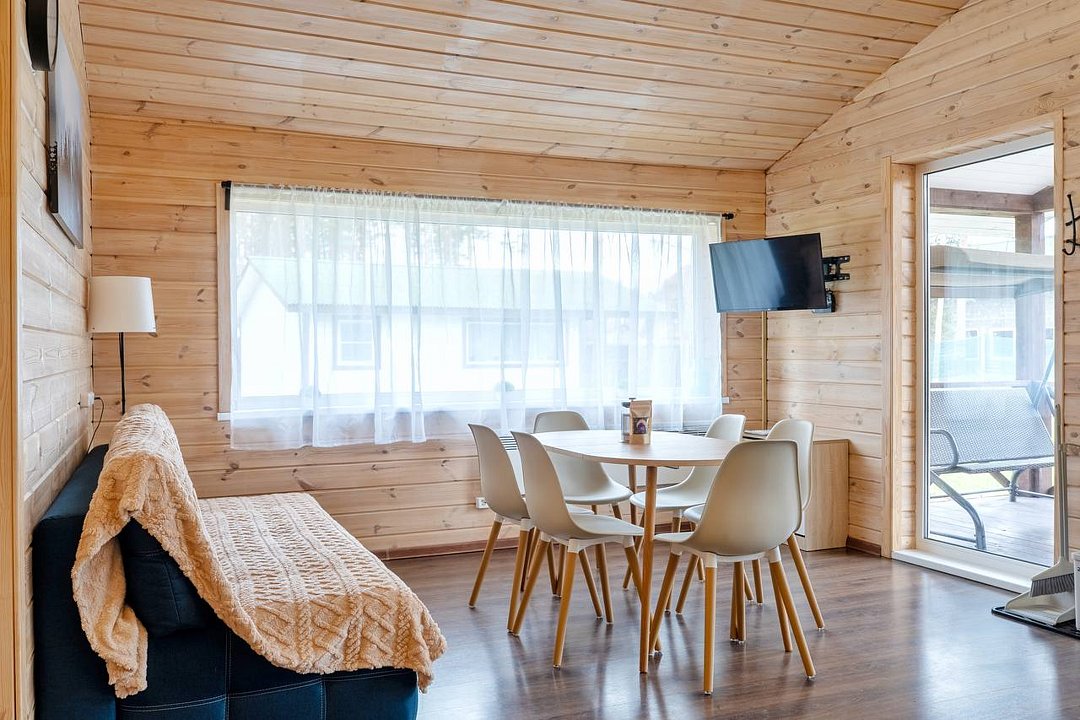3 спальни (двуспальные и 1-но спальные кровати), ТВ, 2 с/у, душ, баня, кухня-гостиная с диваном.