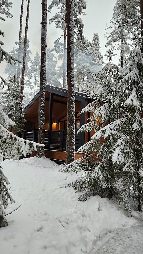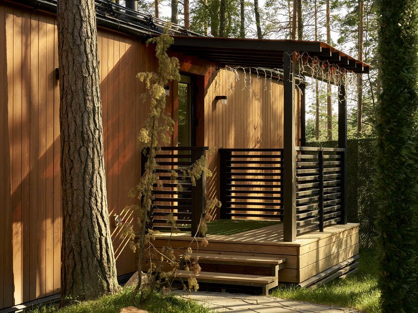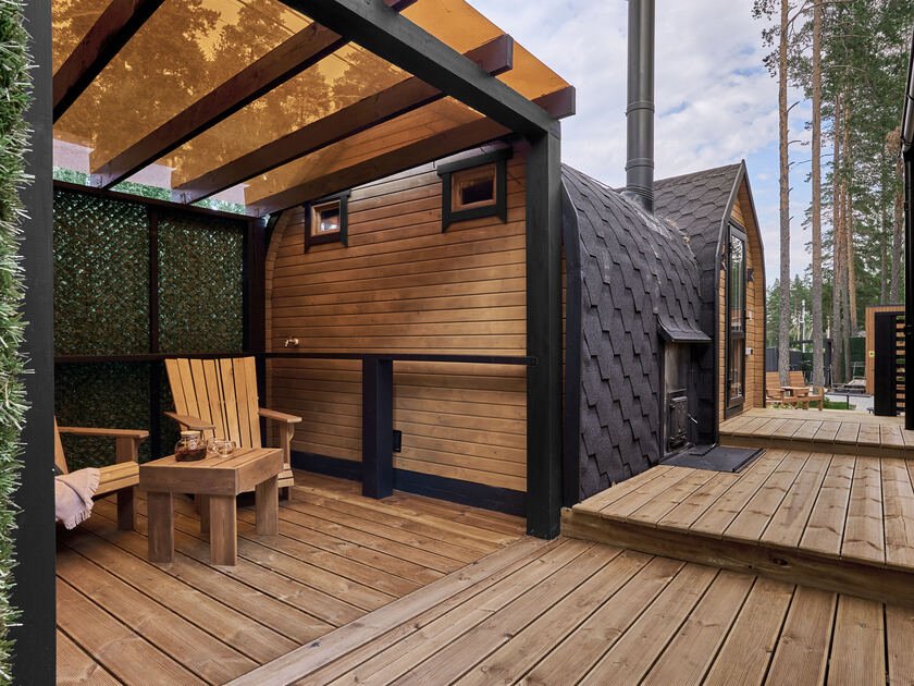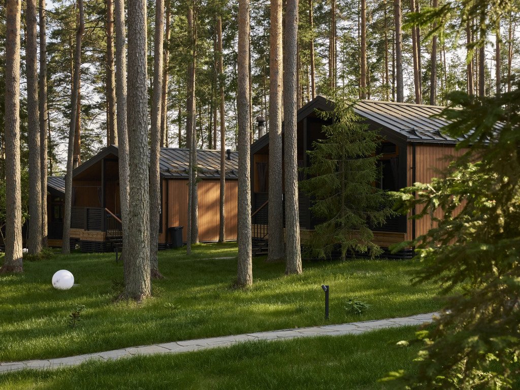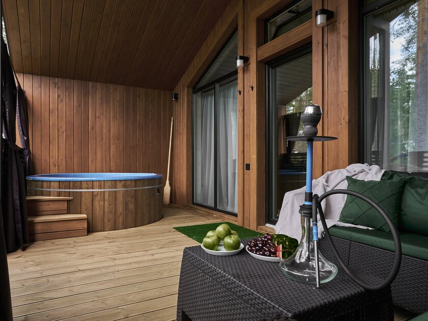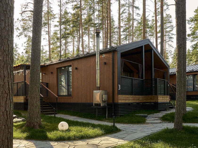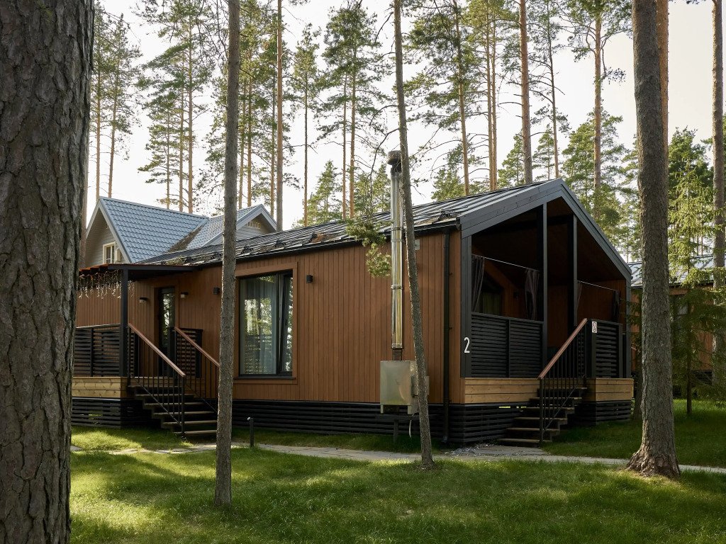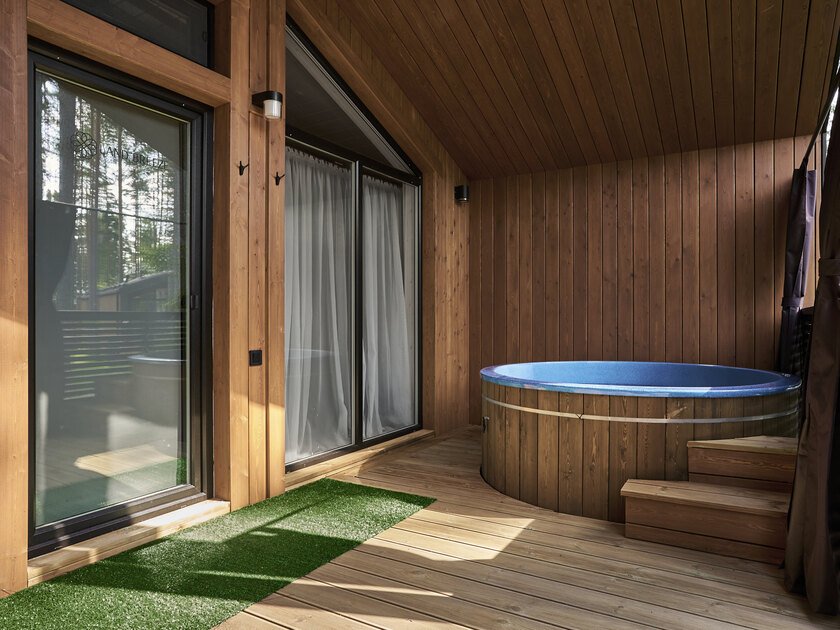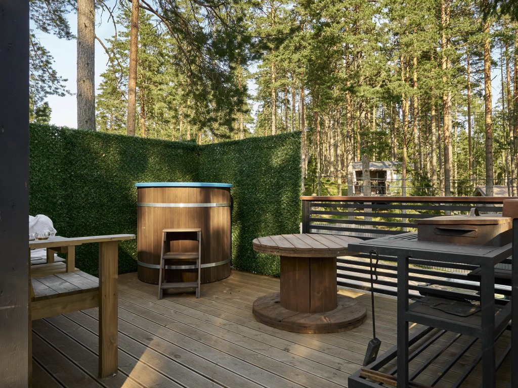 Во всех домах есть собственная терраса с купелью, панорамное остекление и потрясающие виды на хвойный лес.