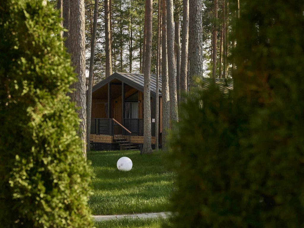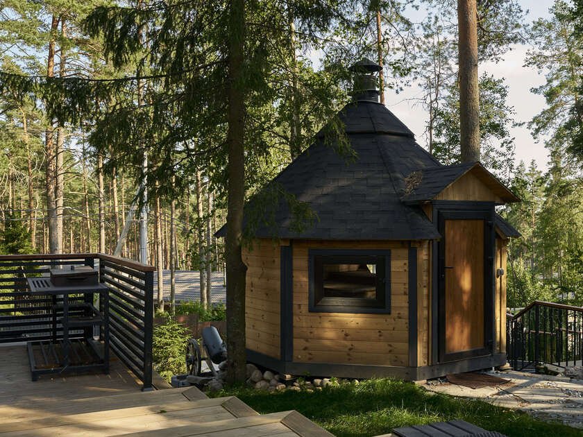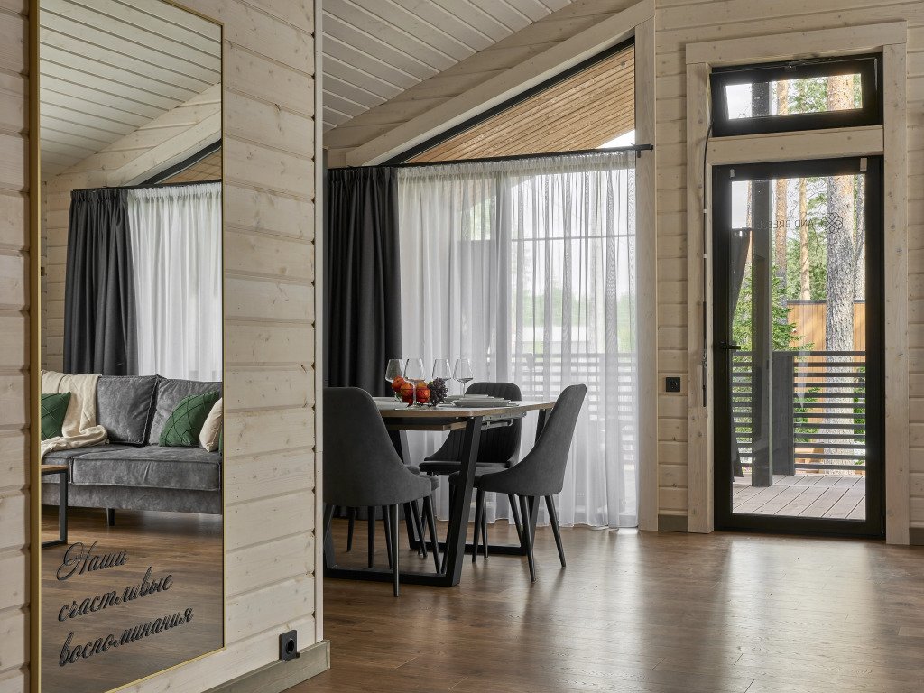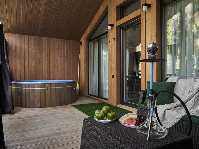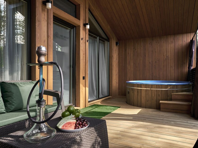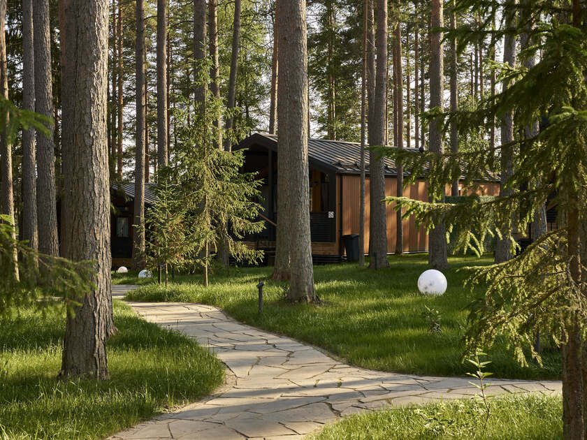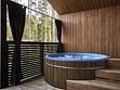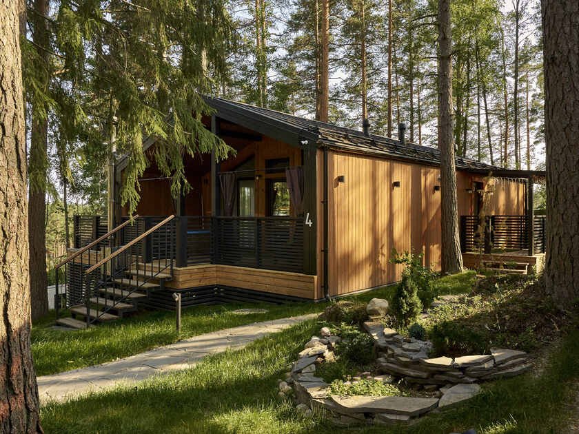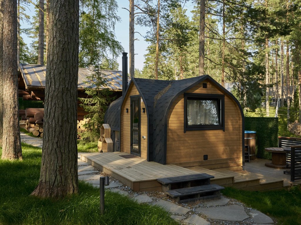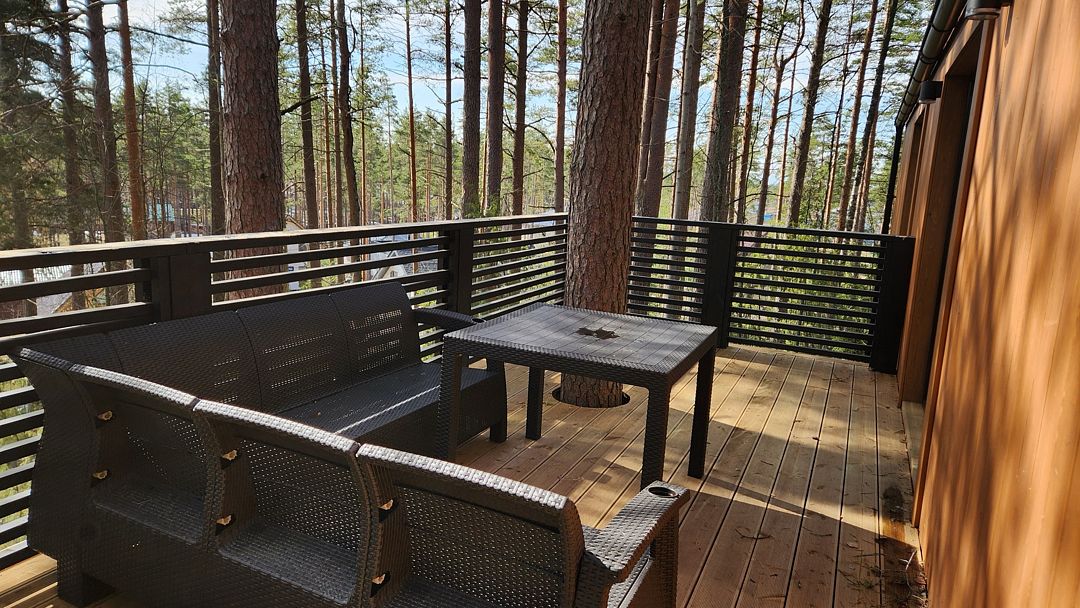 Во всех домах есть собственная терраса с купелью, панорамное остекление и потрясающие виды на хвойный лес.