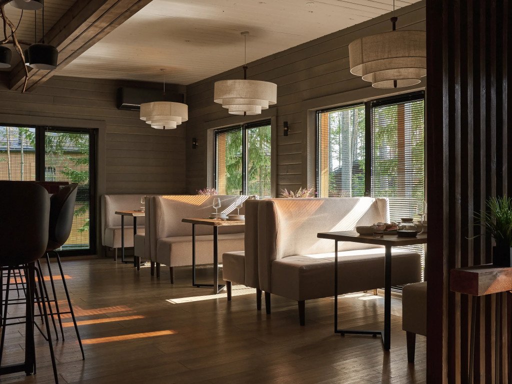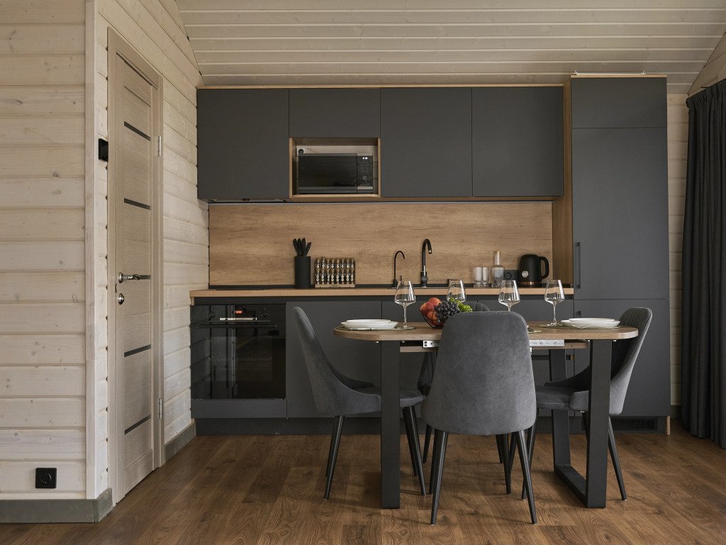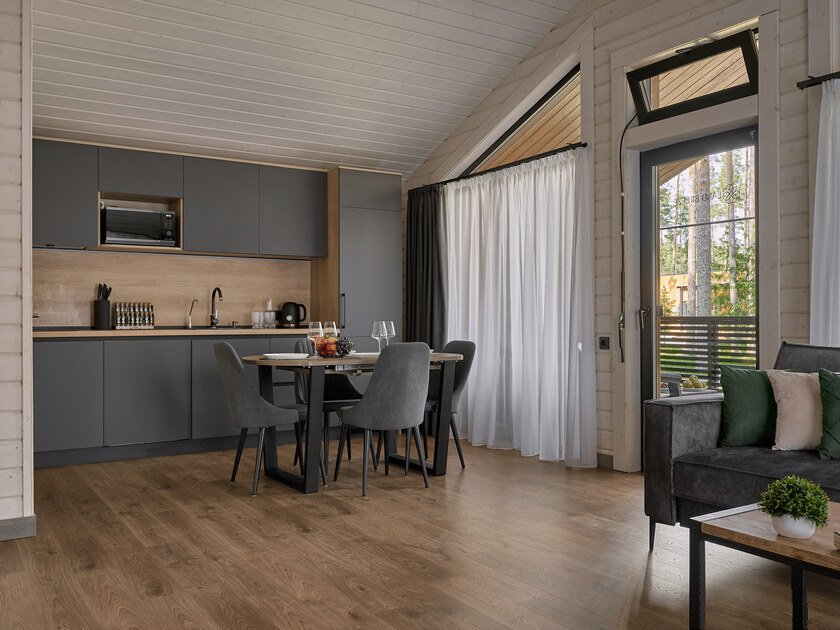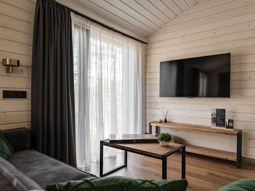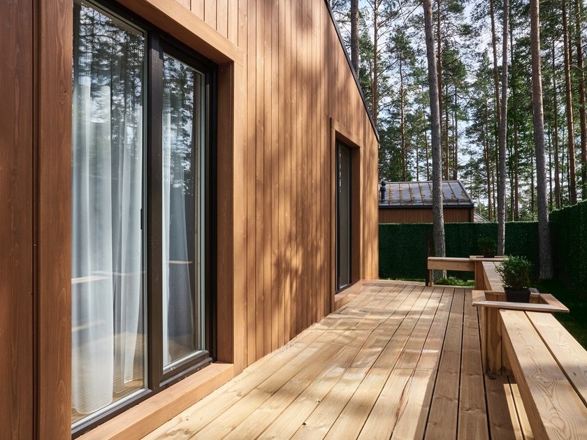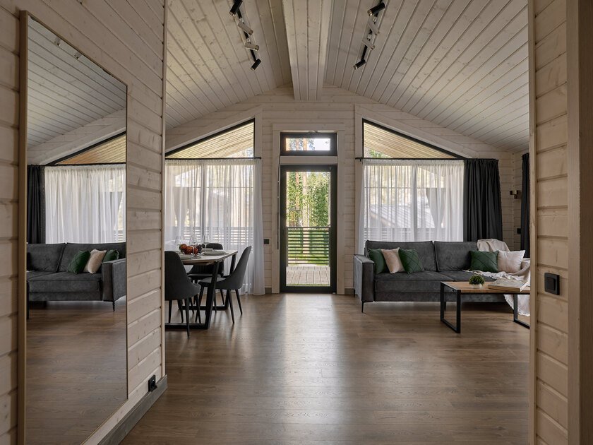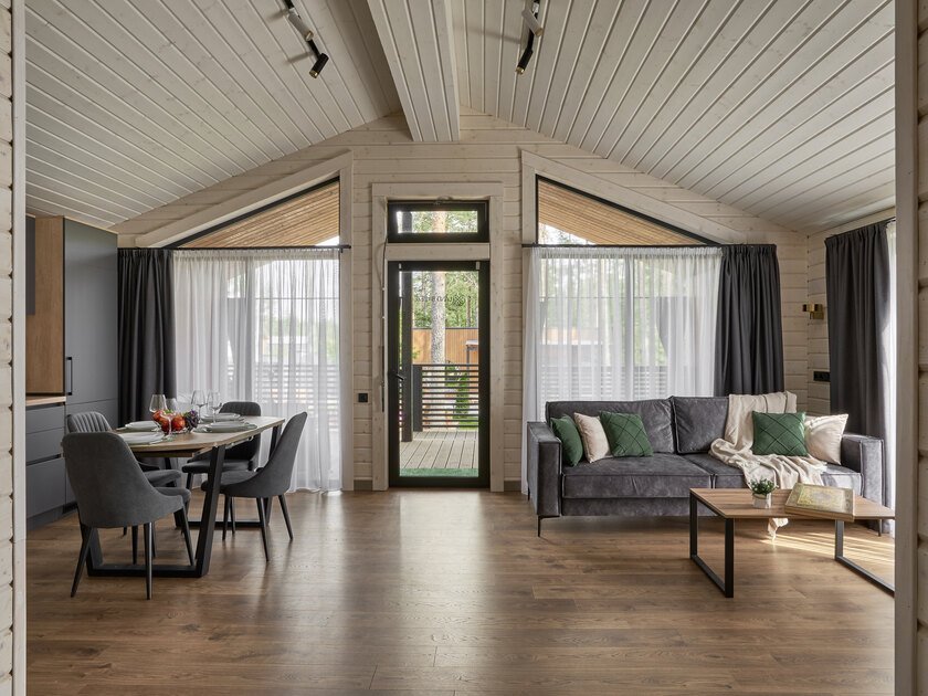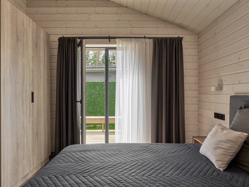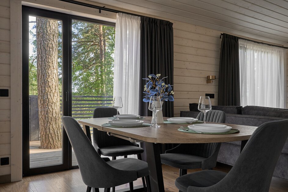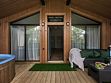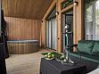 Во всех домах есть собственная терраса с купелью, панорамное остекление и потрясающие виды на хвойный лес.