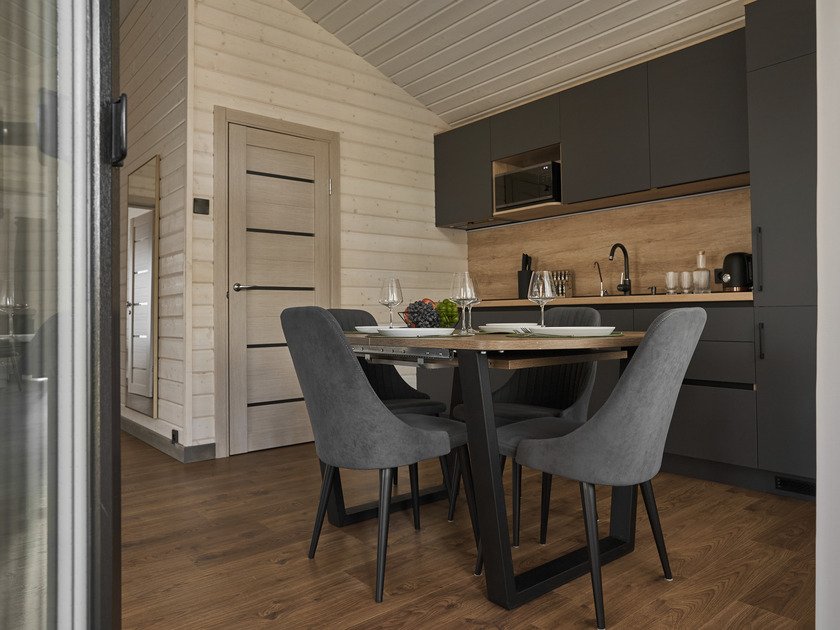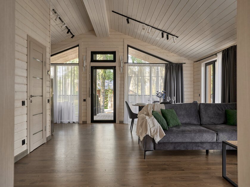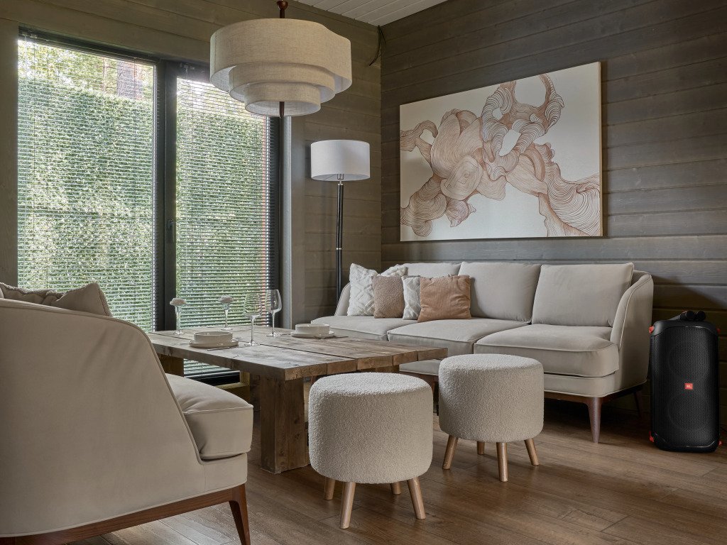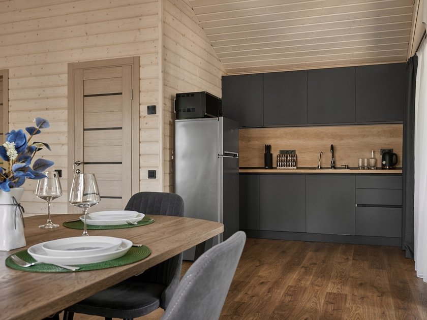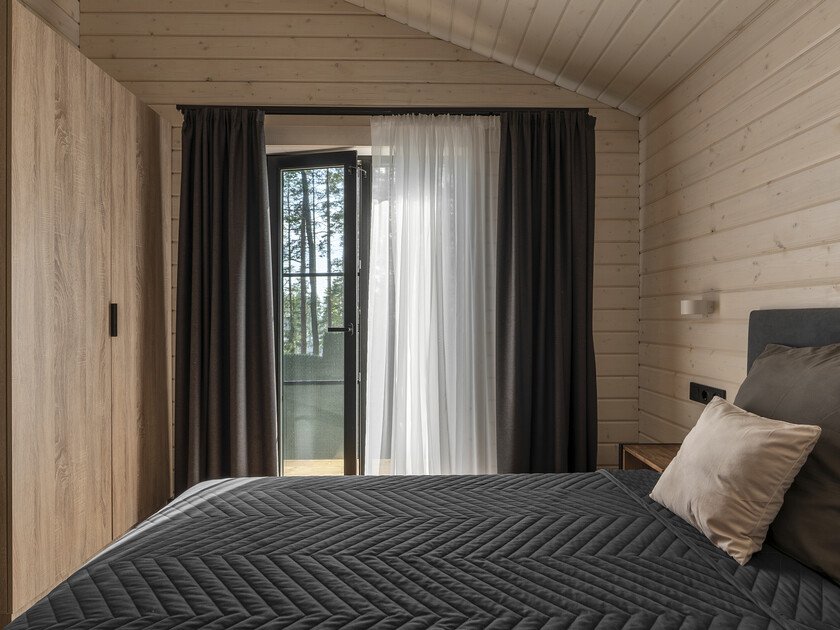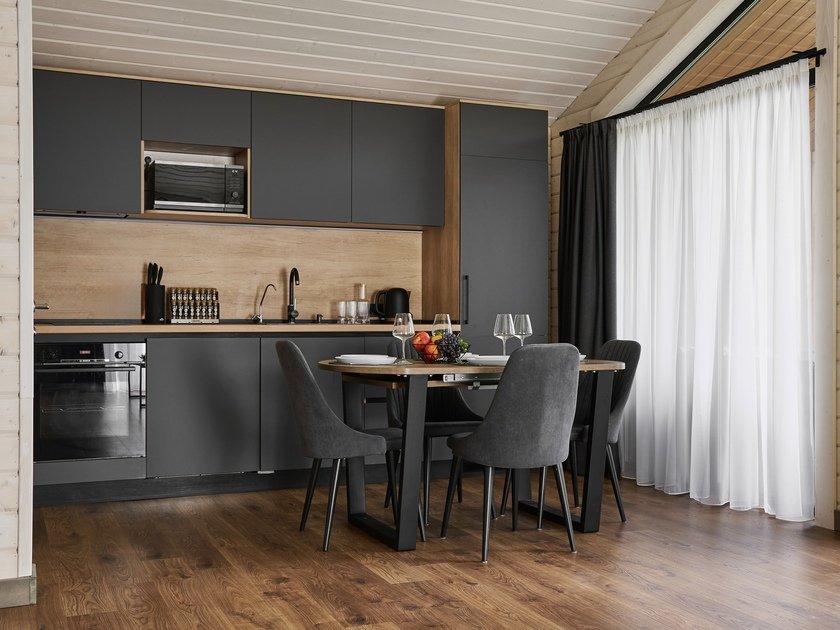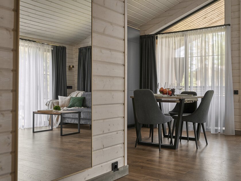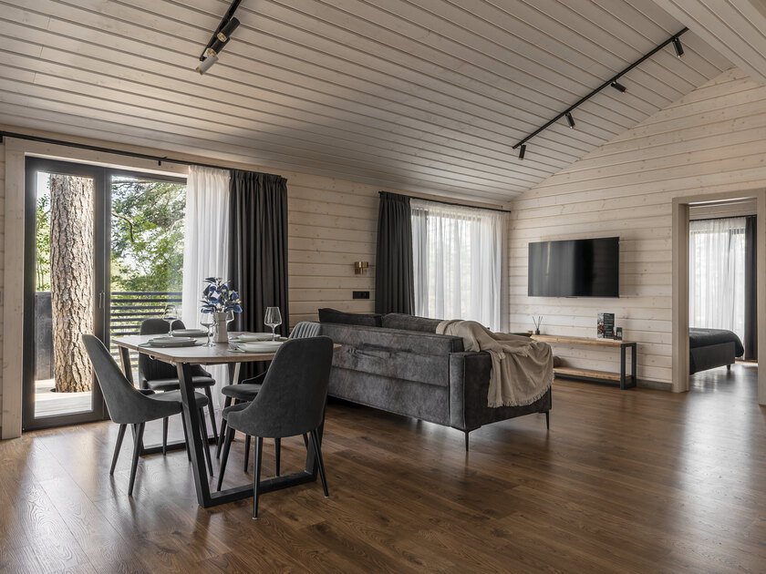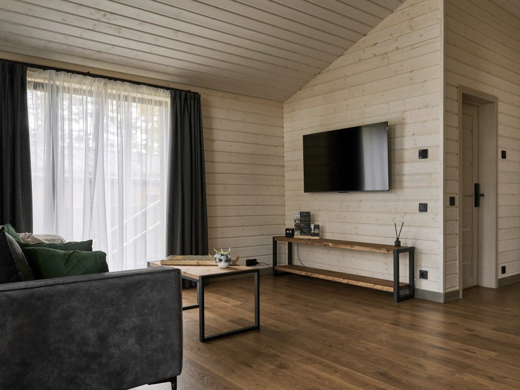 Во всех домах есть собственная терраса с купелью, панорамное остекление и потрясающие виды на хвойный лес.