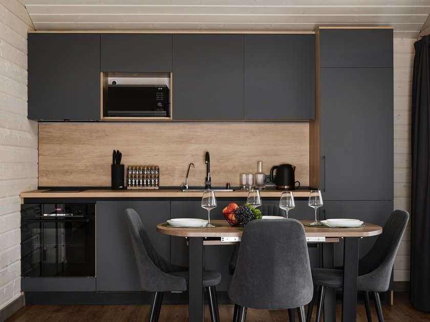- техника (телевизор Smart TV, электрическая плита, чайник, холодильник, СВЧ печь, фен, бойлер, посудомоечная машина, встроенный фильтр с питьевой водой);
