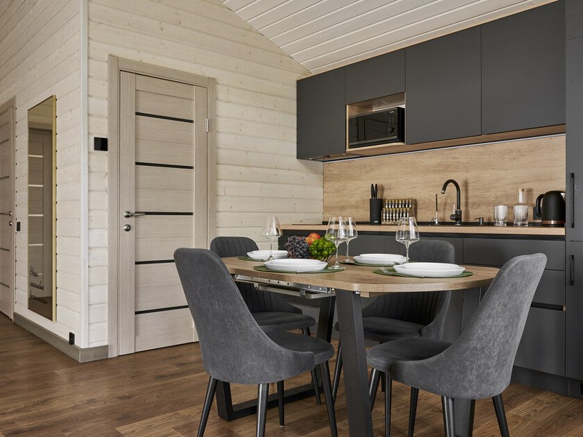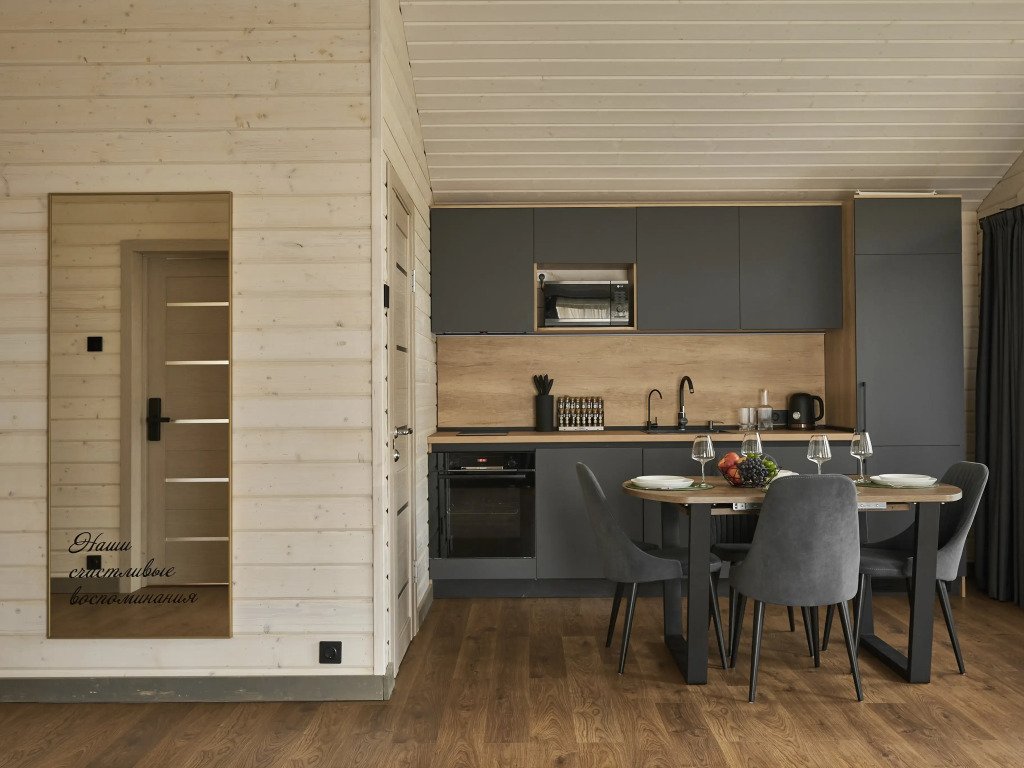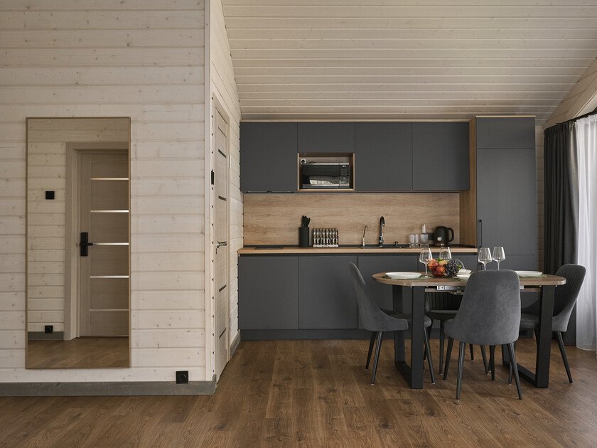 Для 6 гостей (количество гостей обсуждается по согласованию). 2 спальни с евро кроватями + большая кухня-гостиная с раскладным диваном.