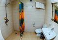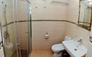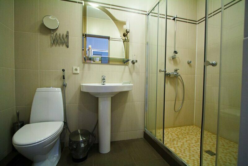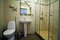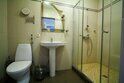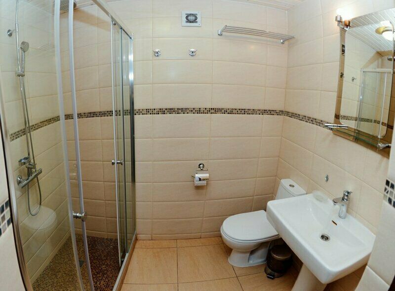 Ванная комната в номере «Комфорт»: душевая кабина, унитаз, раковина, зеркало, холодная и горячая вода, косметика, полотенца.